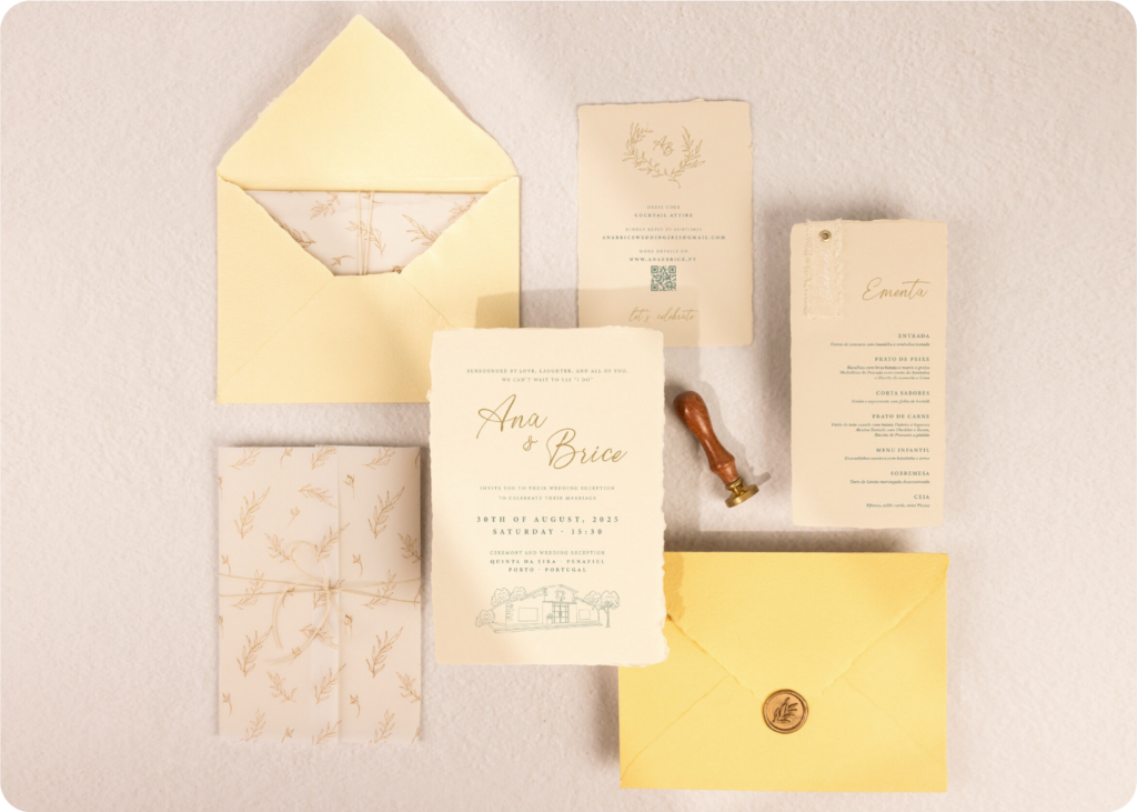 Além de convites, oferecemos um conjunto completo de estacionário para casamentos, incluindo marcadores de mesa, placas de boas-vindas, ementas, caixas de alianças, placa meninos das alianças, seating plan, missal, marcador de lugar, caixa de cartões de agradecimento, livros de honra. Crie uma experiência coesa e memorável para os seus convidados com o nosso estacionário.