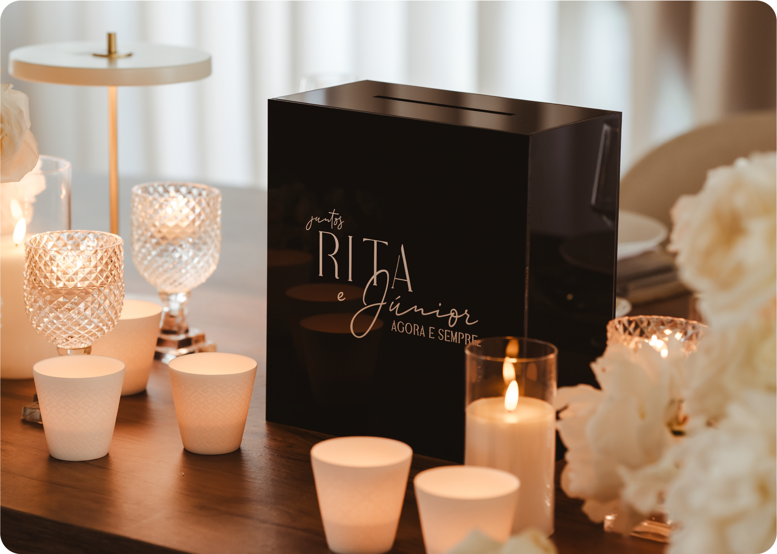 A caixa de presentes personalizada torna-se um elemento essencial nos casamentos de 2026. Para além de organizar os presentes dos convidados de forma prática e segura, funciona como um elemento decorativo alinhado com o restante estacionário e com o conceito do casamento. Um detalhe funcional que não passa despercebido.