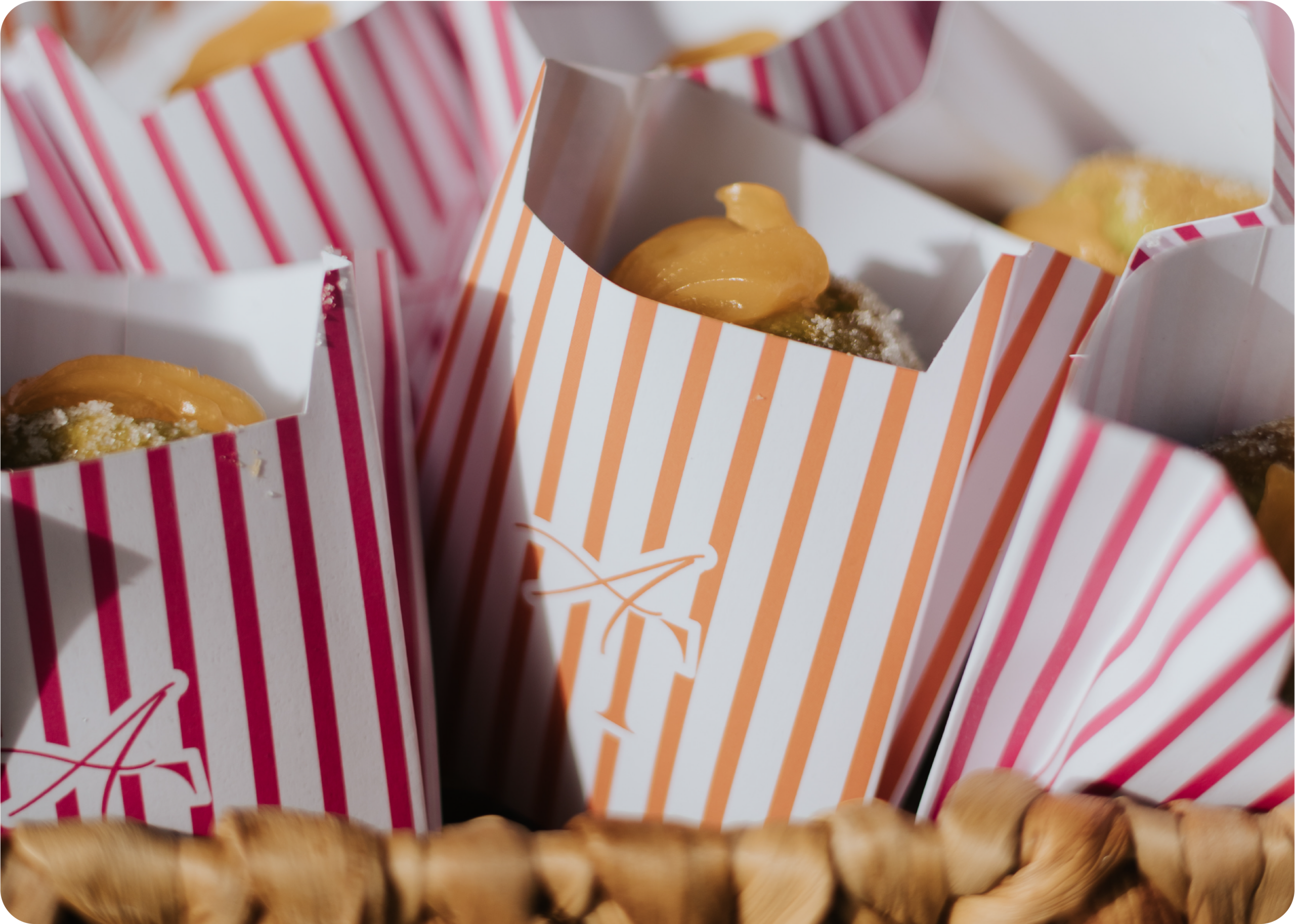 Os sacos personalizados para bolas de Berlim, pipocas, entre outros são uma tendência divertida e cheia de personalidade para 2026. Estes detalhes criam momentos descontraídos ao longo da celebração e surpreendem os convidados de forma simples, mas memorável. Totalmente personalizáveis, adaptam-se ao tema e estilo do casamento, reforçando a identidade visual do evento.