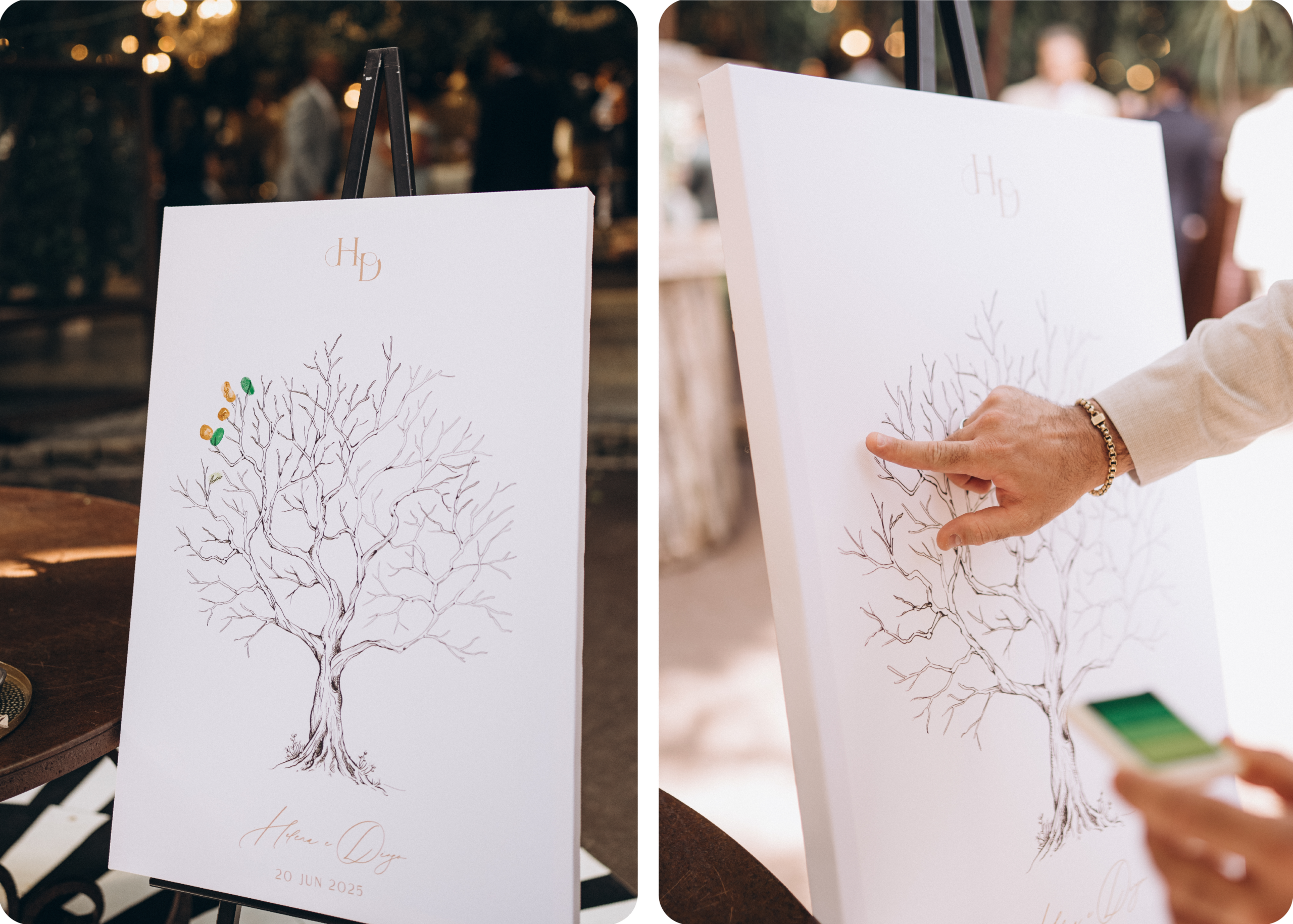 A tela da árvore continua a ser uma das tendências mais procuradas para casamentos em 2026. Esta peça convida os convidados a deixarem a sua impressão digital, criando uma peça única e emocional. Para além de um momento especial durante o casamento, a tela da árvore transforma-se numa recordação decorativa que os noivos podem guardar para sempre, relembrando um dia tão especia