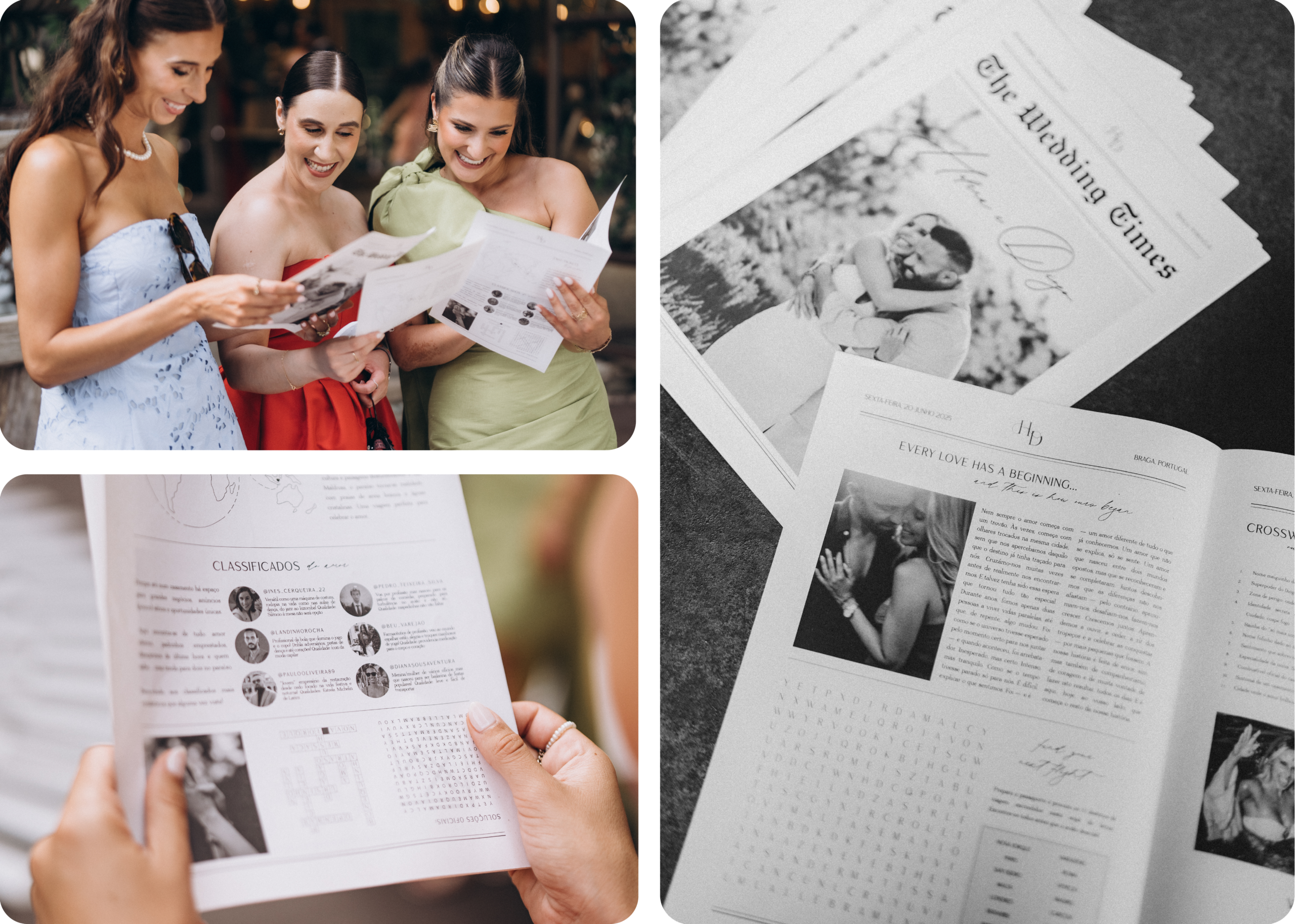 O jornal de casamento afirma-se como uma tendência original e diferenciadora. Mais do que um simples detalhe, permite contar a história do casal, apresentar o programa do dia, incluir curiosidades ou mensagens especiais. É uma peça personalizada que surpreende os convidados e acrescenta um toque criativo e descontraído ao casamento, tornando-se também uma bonita lembrança do dia.