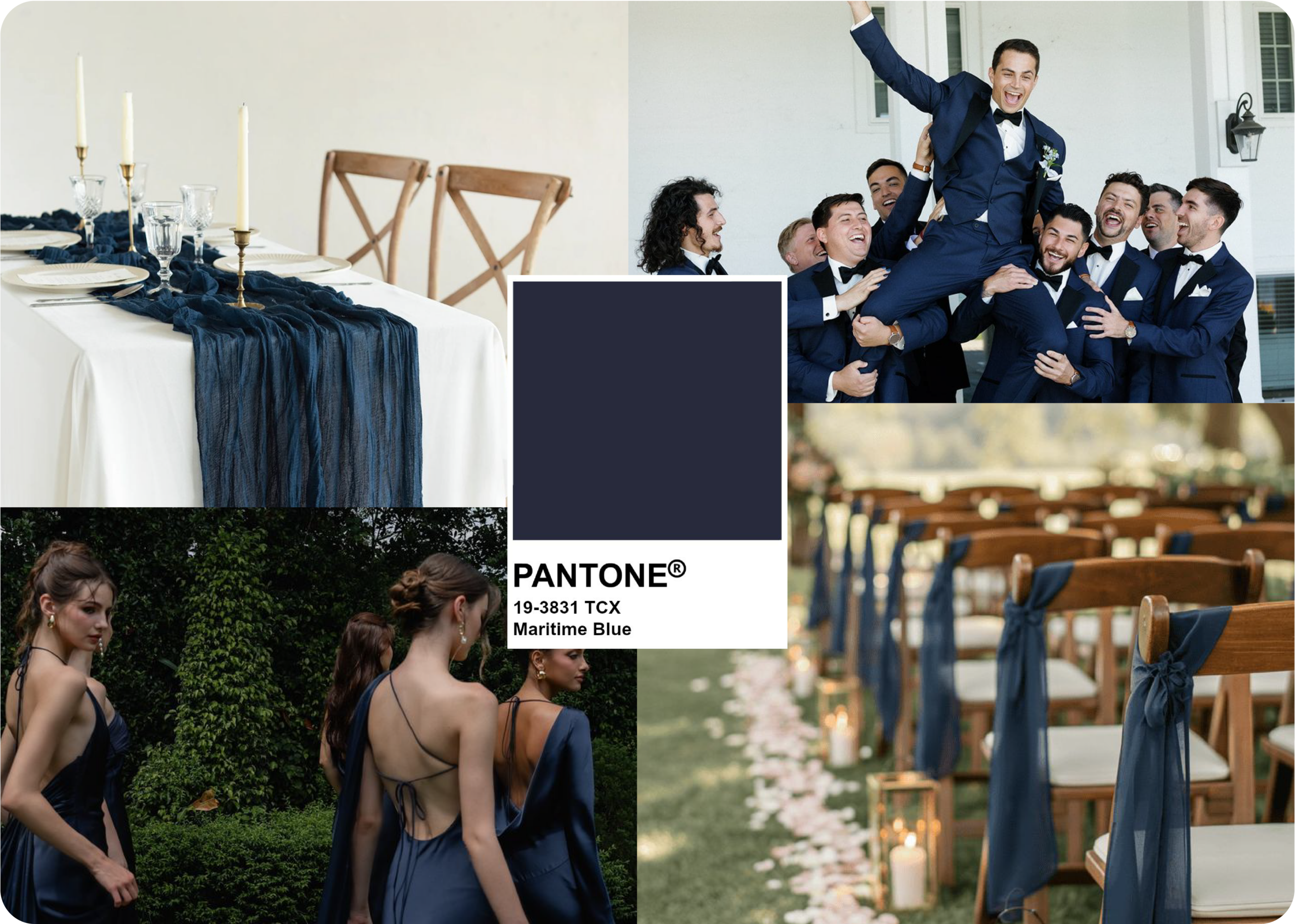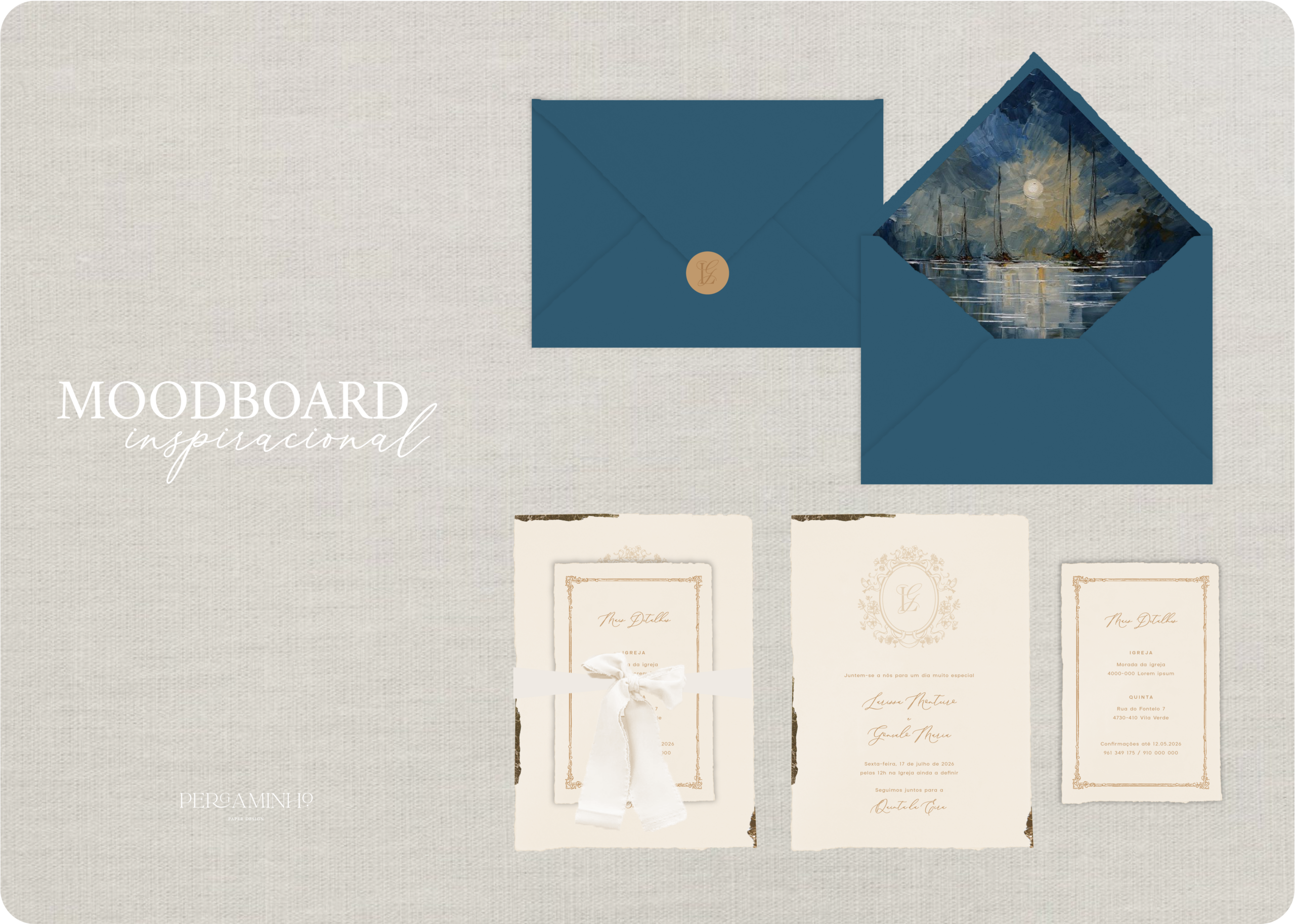 Inspirado no mar, o Maritime Blue é um azul profundo e elegante que transmite tranquilidade e confiança. É uma excelente opção para convites de casamento sofisticados e intemporais.