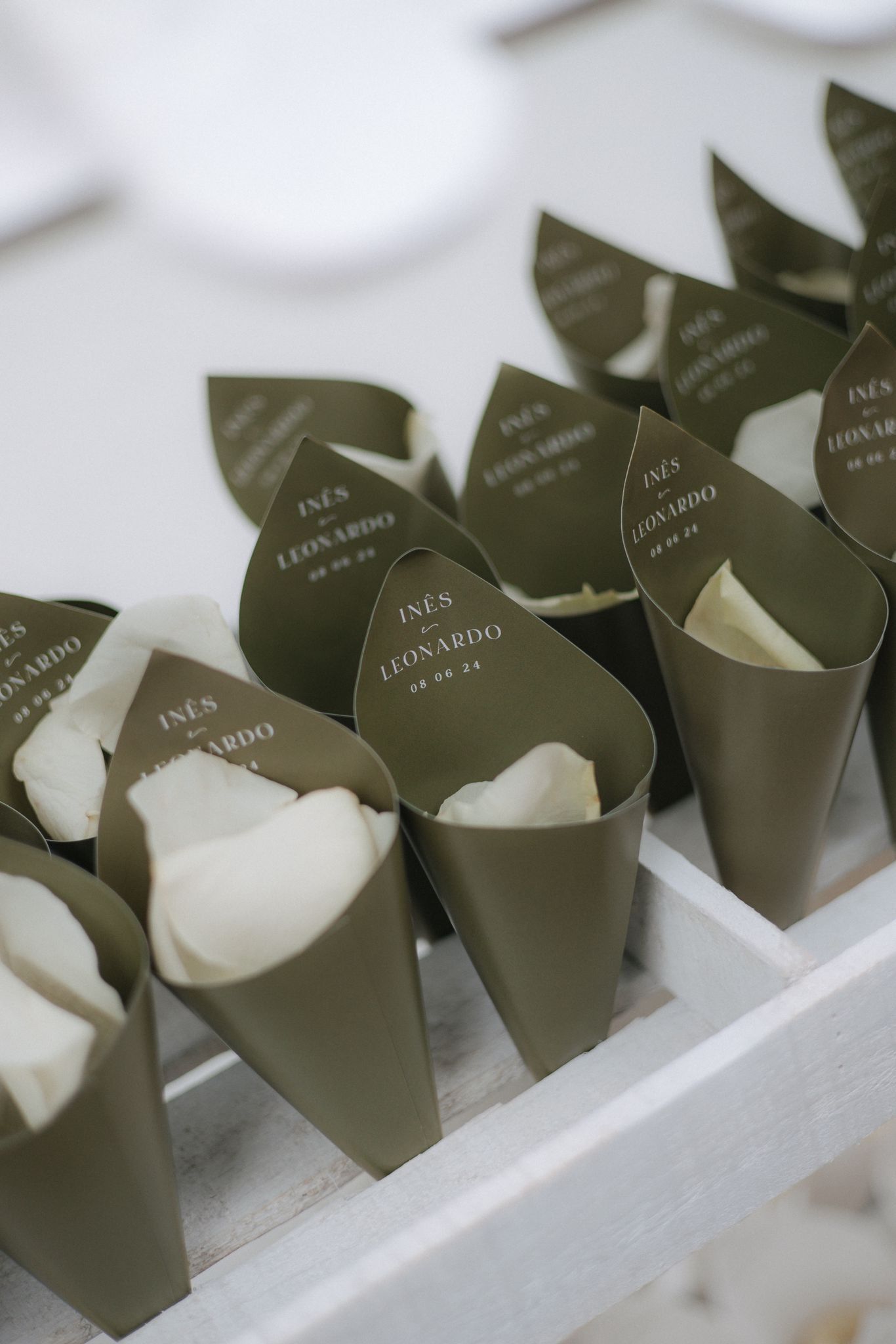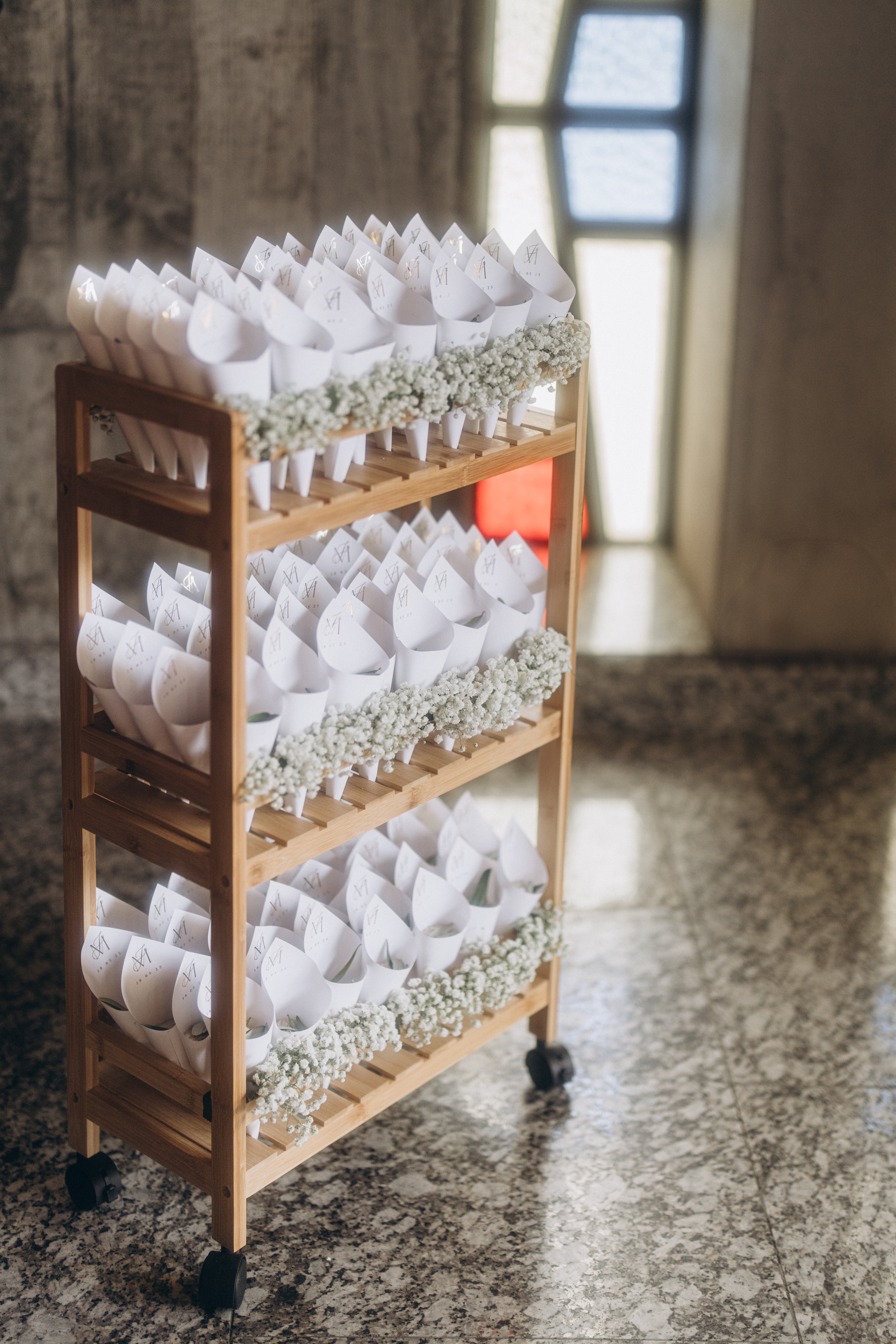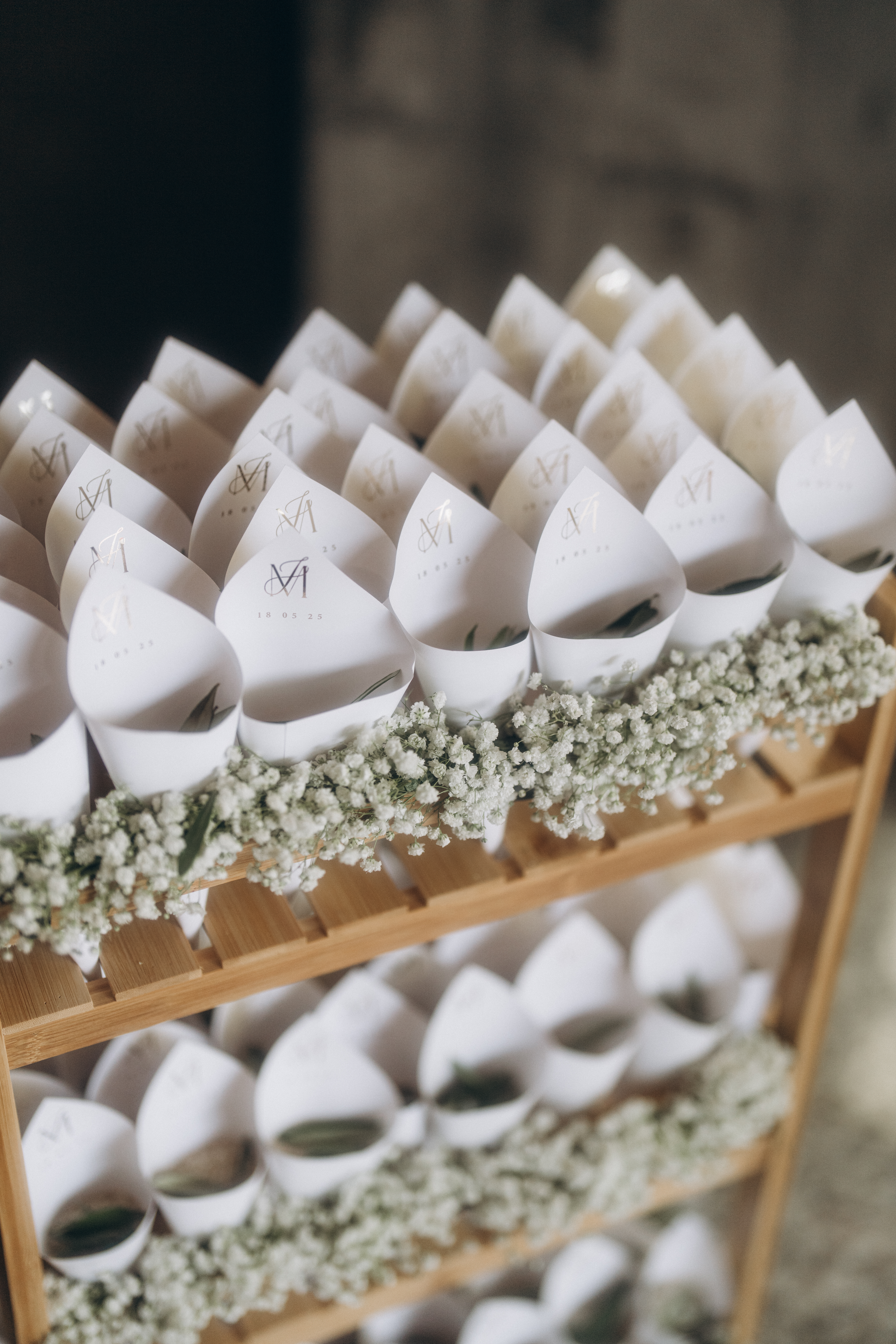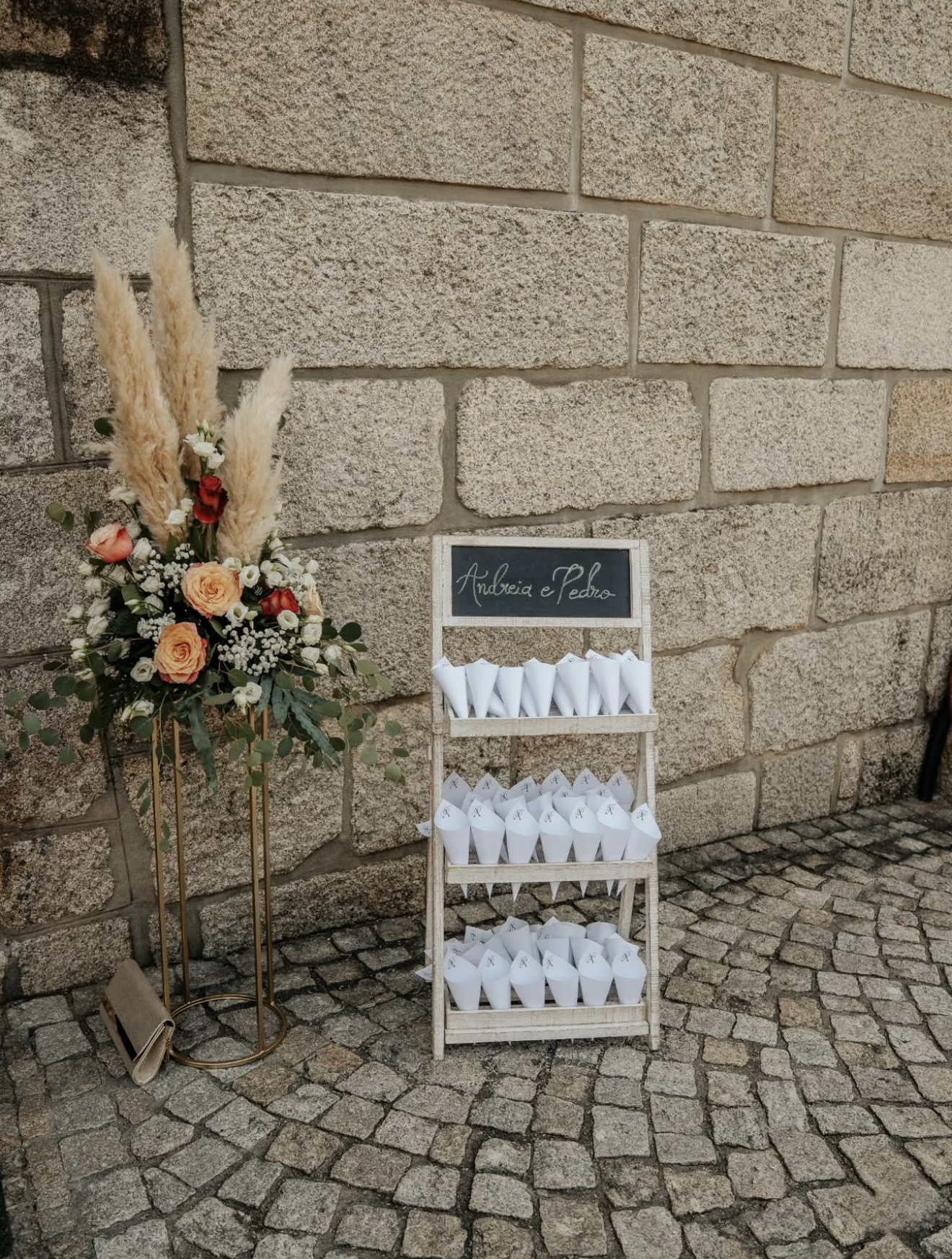 Cada cone é cuidadosamente criado para combinar com o estilo e a paleta de cores do vosso casamento, tornando-se um elemento decorativo que harmoniza com toda a identidade visual do evento.