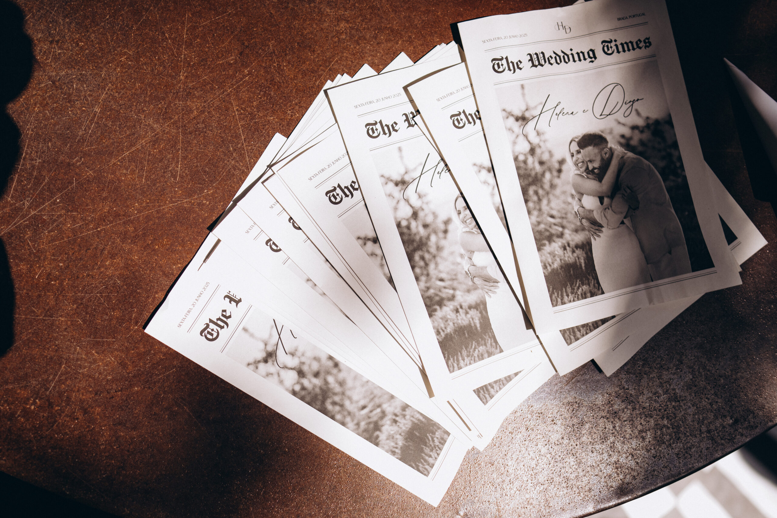 O jornal de casamento personalizado é uma forma criativa e emocionante de partilhar a vossa história com os convidados. Mais do que uma simples lembrança, é uma peça de única que transforma o vosso amor em palavras, fotografias e detalhes cheios de significado.