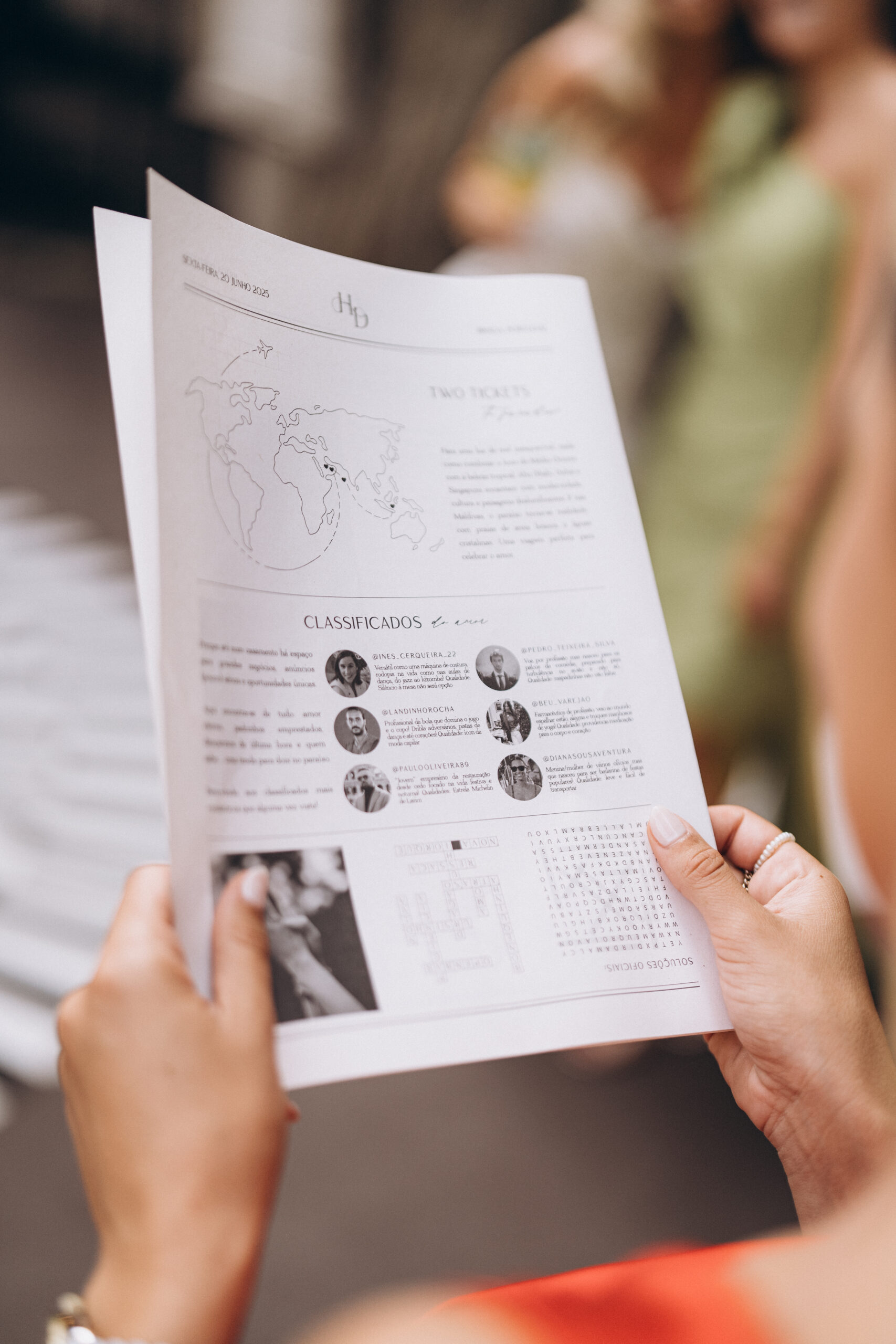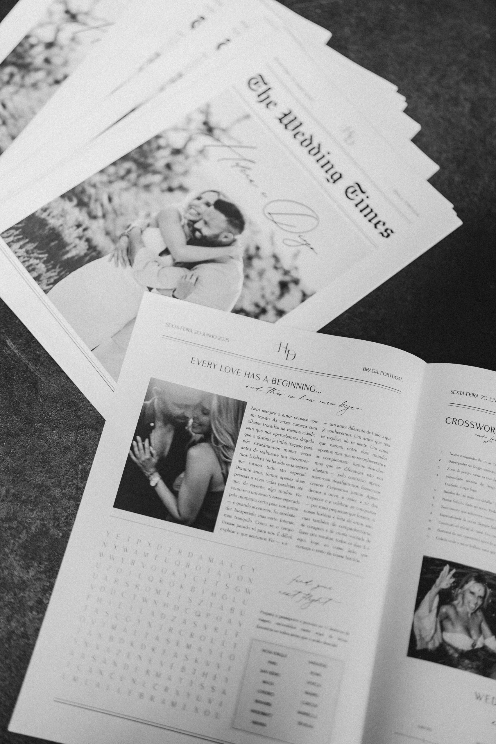 O jornal de casamento é uma forma original e envolvente de partilhar a vossa história com quem mais amam. É uma peça criada com alma, onde cada detalhe — do design à escrita — é pensado para refletir a vossa essência.