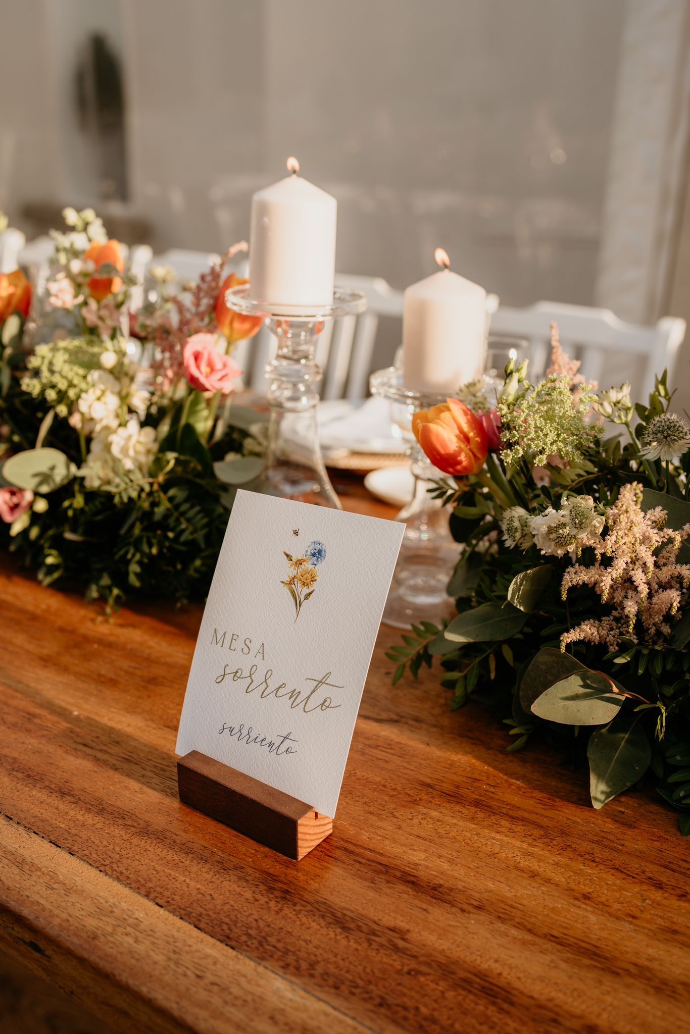 Marcador de mesa e seating plan com detalhes florais e base de madeira