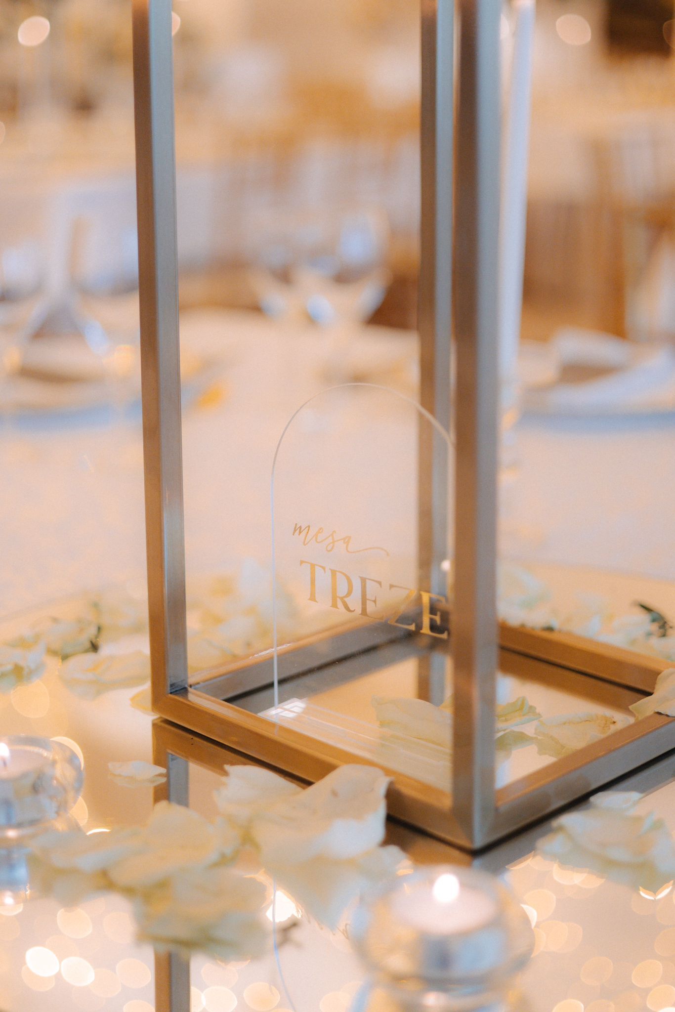 Marcador de mesa em acrílico branco como elemento de decoração para mesa de casamento