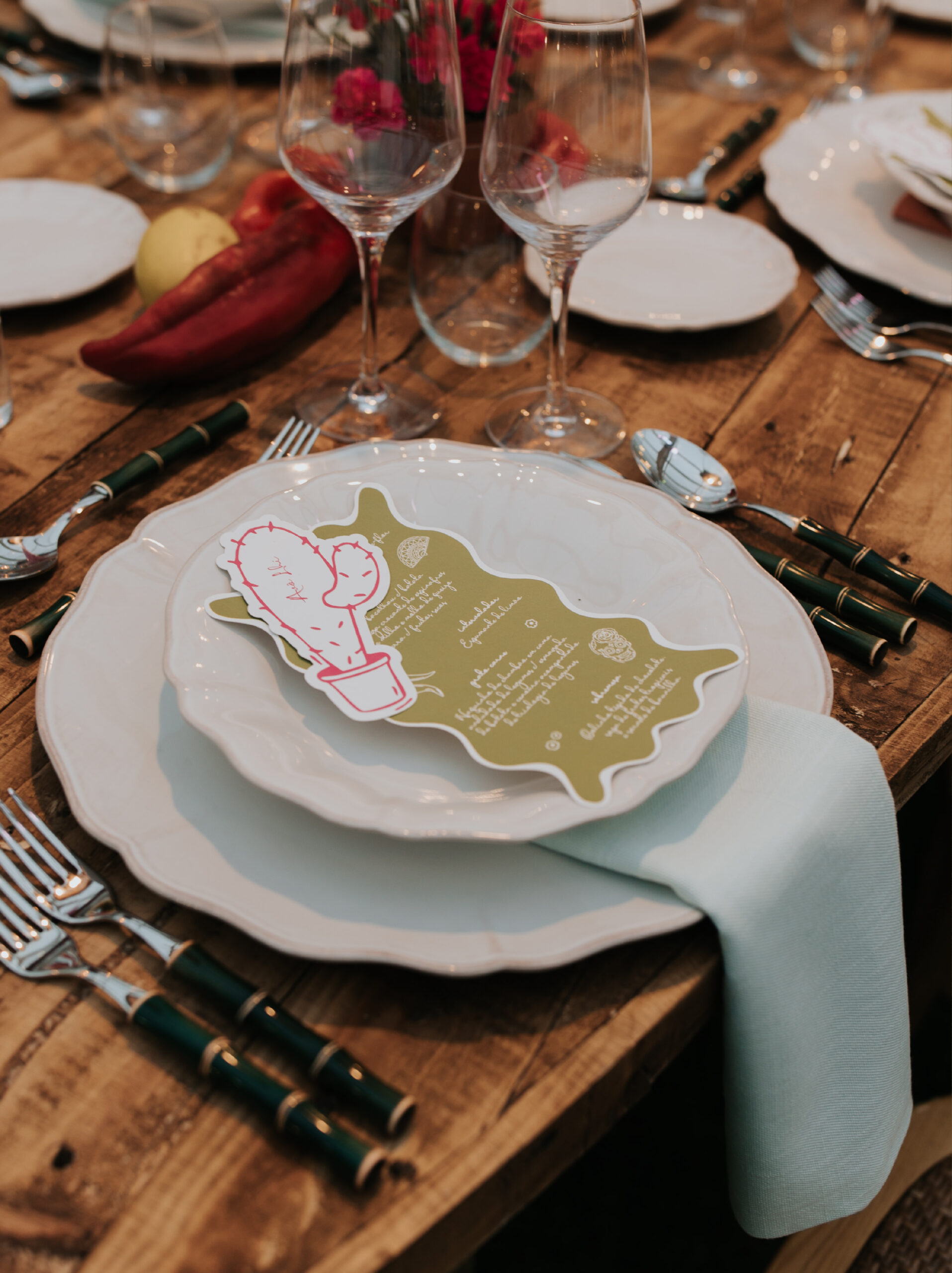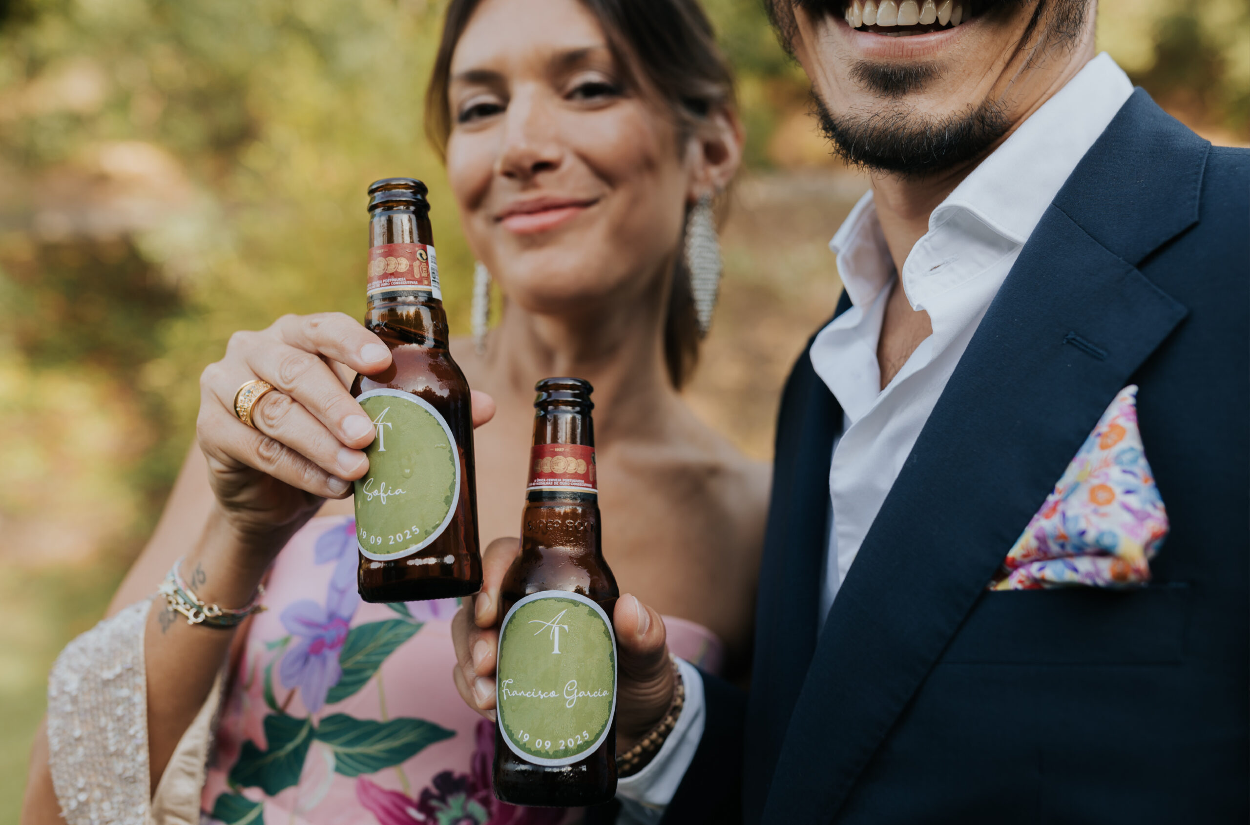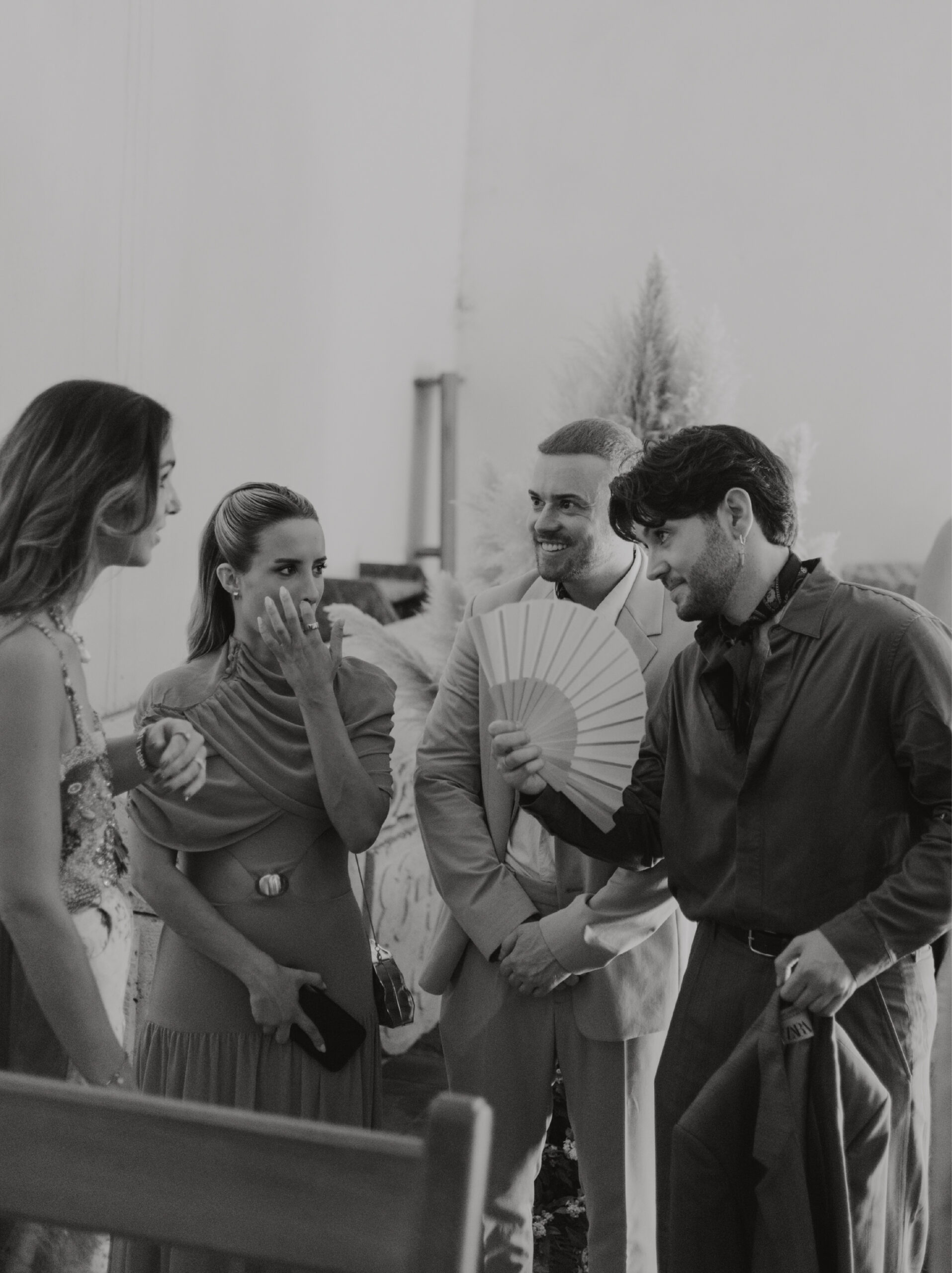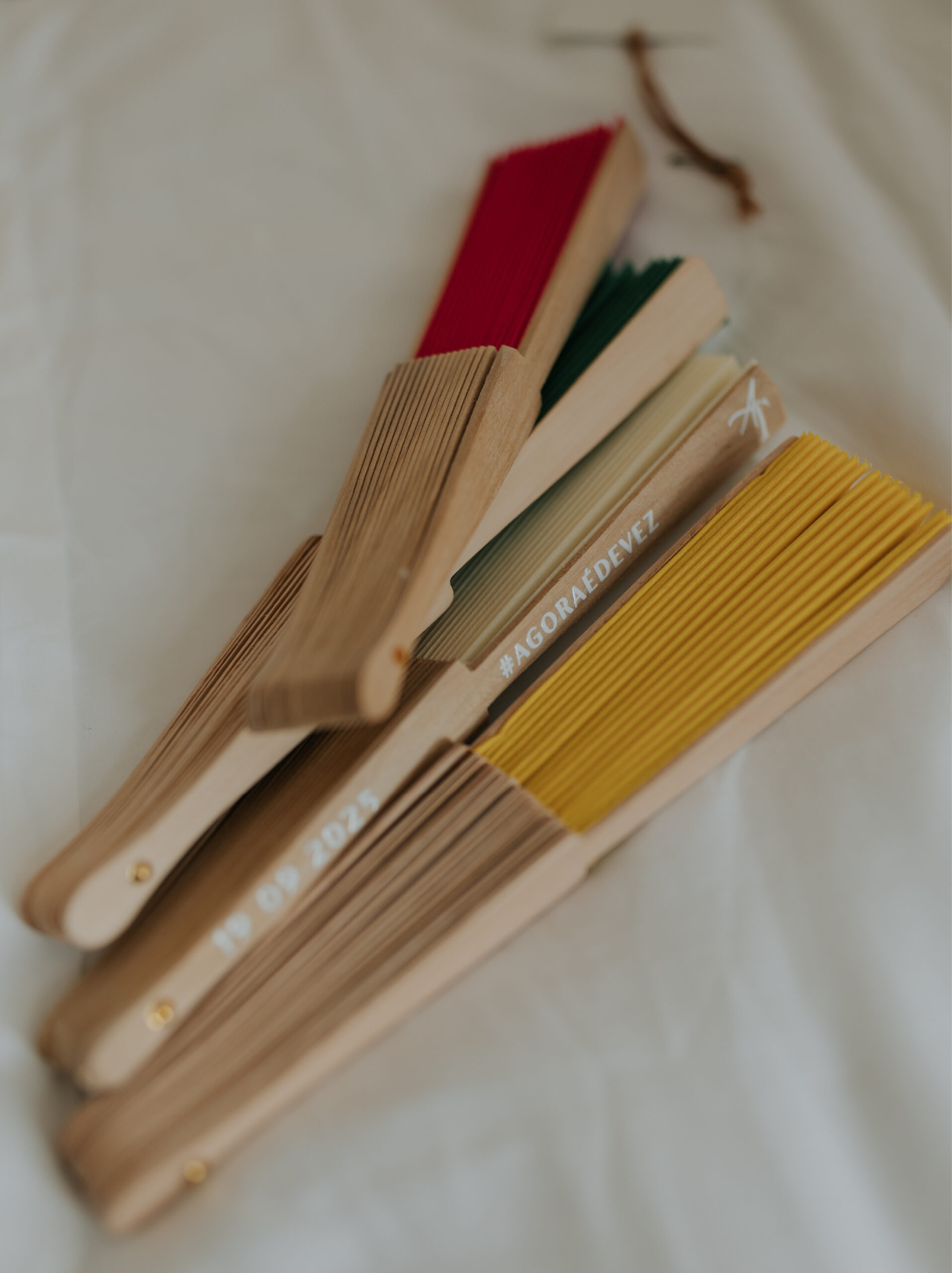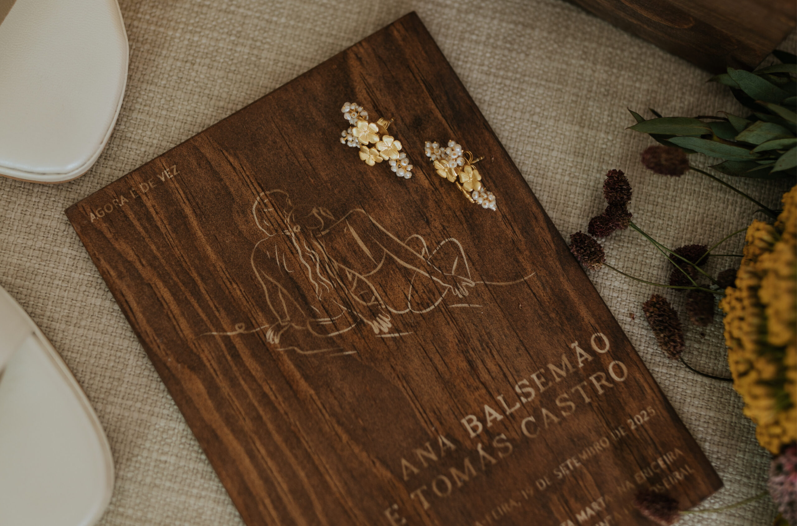 Rústico, autêntico e cheio de presença — assim é o conjunto criado para celebrar o casamento da Ana Balsemão e do Tomás. O convite, desenvolvido em madeira, destaca-se pela sua originalidade e pela textura natural que o torna numa peça verdadeiramente única. Com um design cuidadosamente gravado, cada detalhe ganha profundidade e carácter, refletindo uma estética orgânica e intemporal que marca desde o primeiro momento. Esta identidade estende-se de forma harmoniosa a todos os elementos do casamento, criando uma narrativa visual coesa e envolvente. A caixa de alianças, também em madeira, acompanha o convite na sua essência, guardando um dos momentos mais simbólicos do dia com simplicidade e significado. O missal com um estilo minimalista integra-se de forma subtil na cerimónia. Os leques em madeira acrescentam não só funcionalidade, mas também um apontamento estético elegante, enquanto os cones para o arroz e para as pétalas mantêm a coerência visual, contribuindo para uma atmosfera leve e natural. A receção dos convidados é marcada por uma placa de boas-vindas que reflete esta linguagem, criando desde o primeiro instante uma ligação com todo o ambiente do evento. O seating plan, desenvolvido em tecido, introduz uma textura complementar, equilibrando os materiais e acrescentando suavidade ao conjunto. Cada elemento foi pensado ao detalhe, resultando numa celebração onde a madeira, os materiais naturais e o design se unem de forma autêntica. Este é um reflexo genuíno da essência da Ana e do Tomás — um casamento onde a energia ganha vida, e onde cada pormenor conta uma história com alma e identidade.