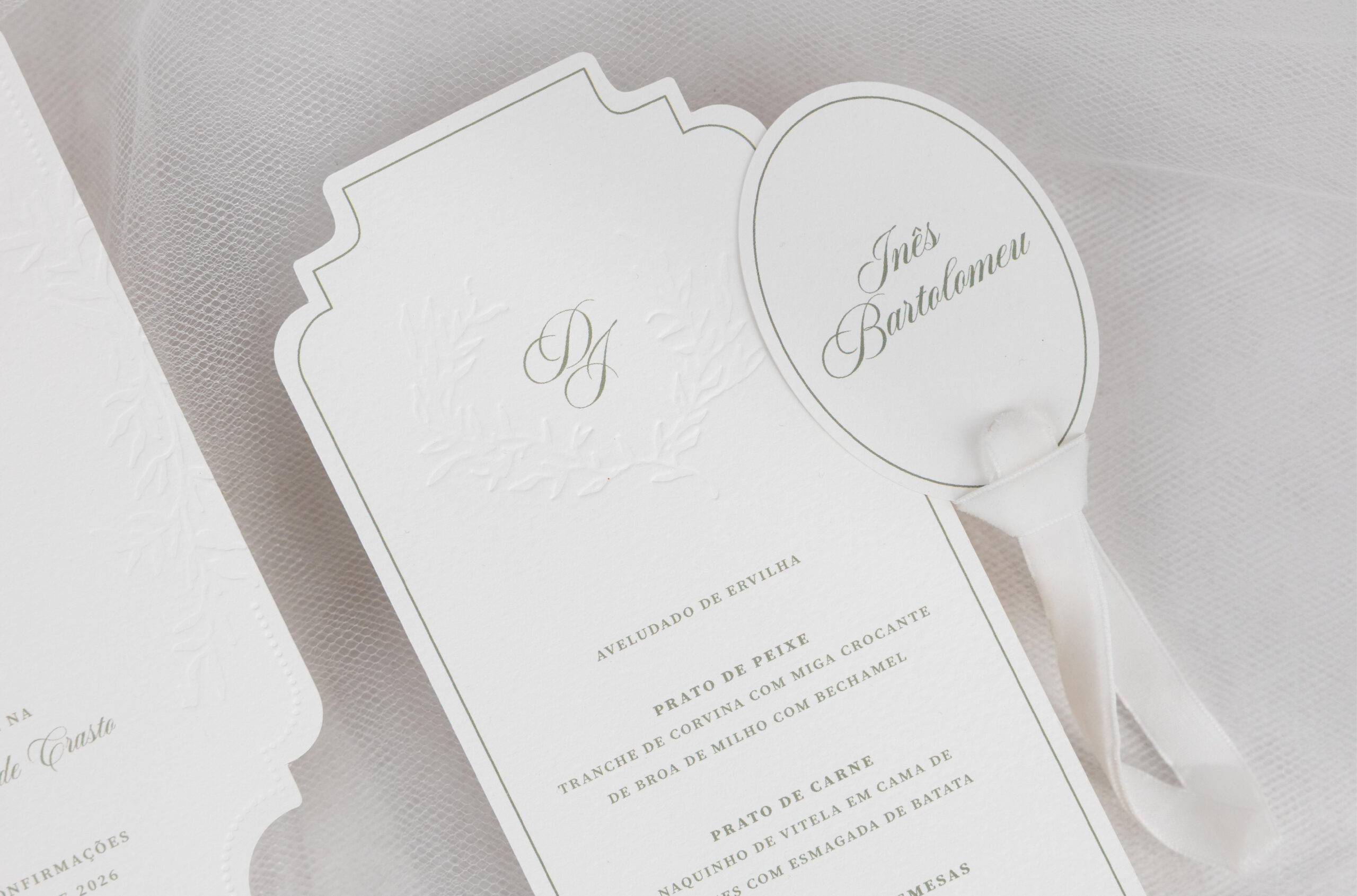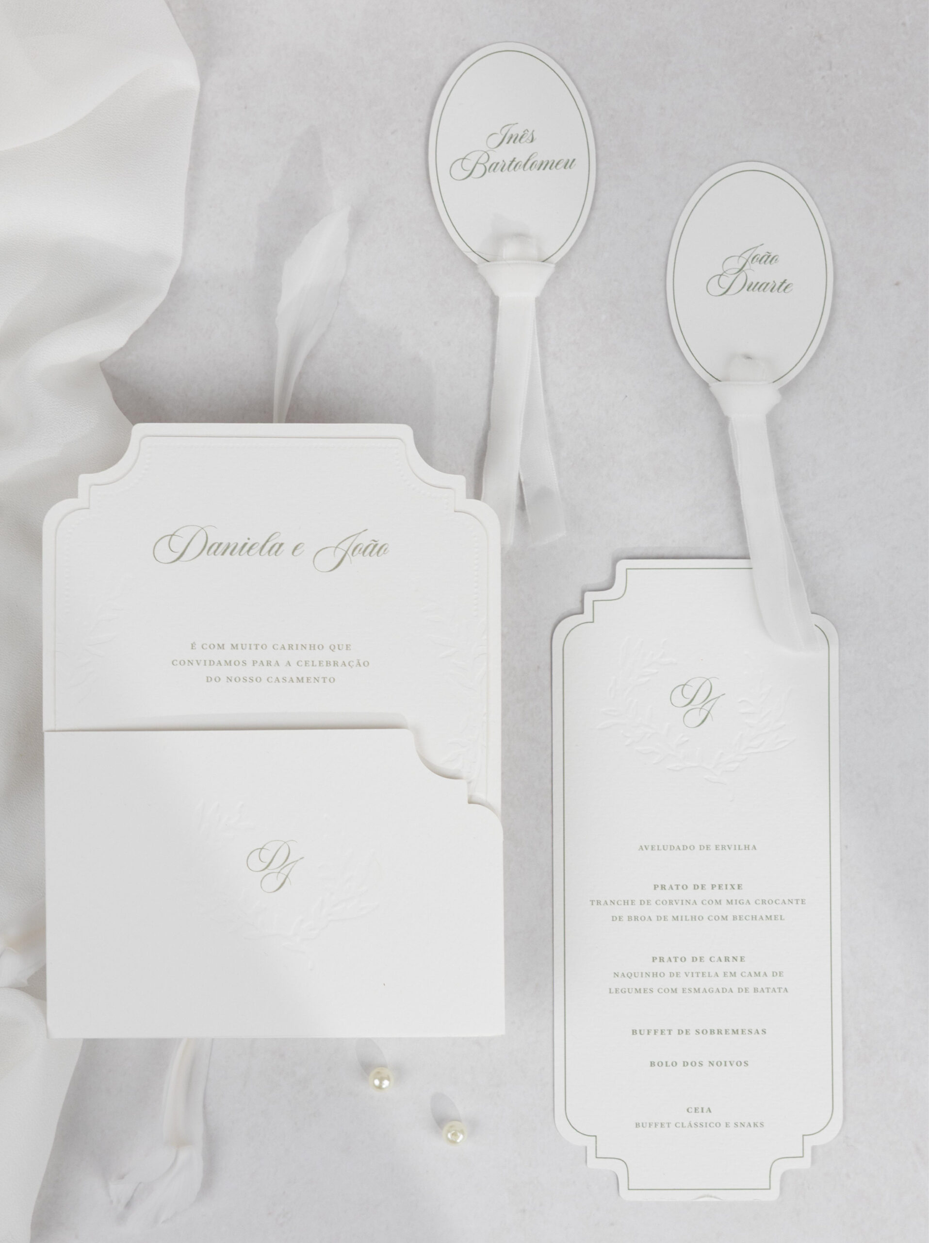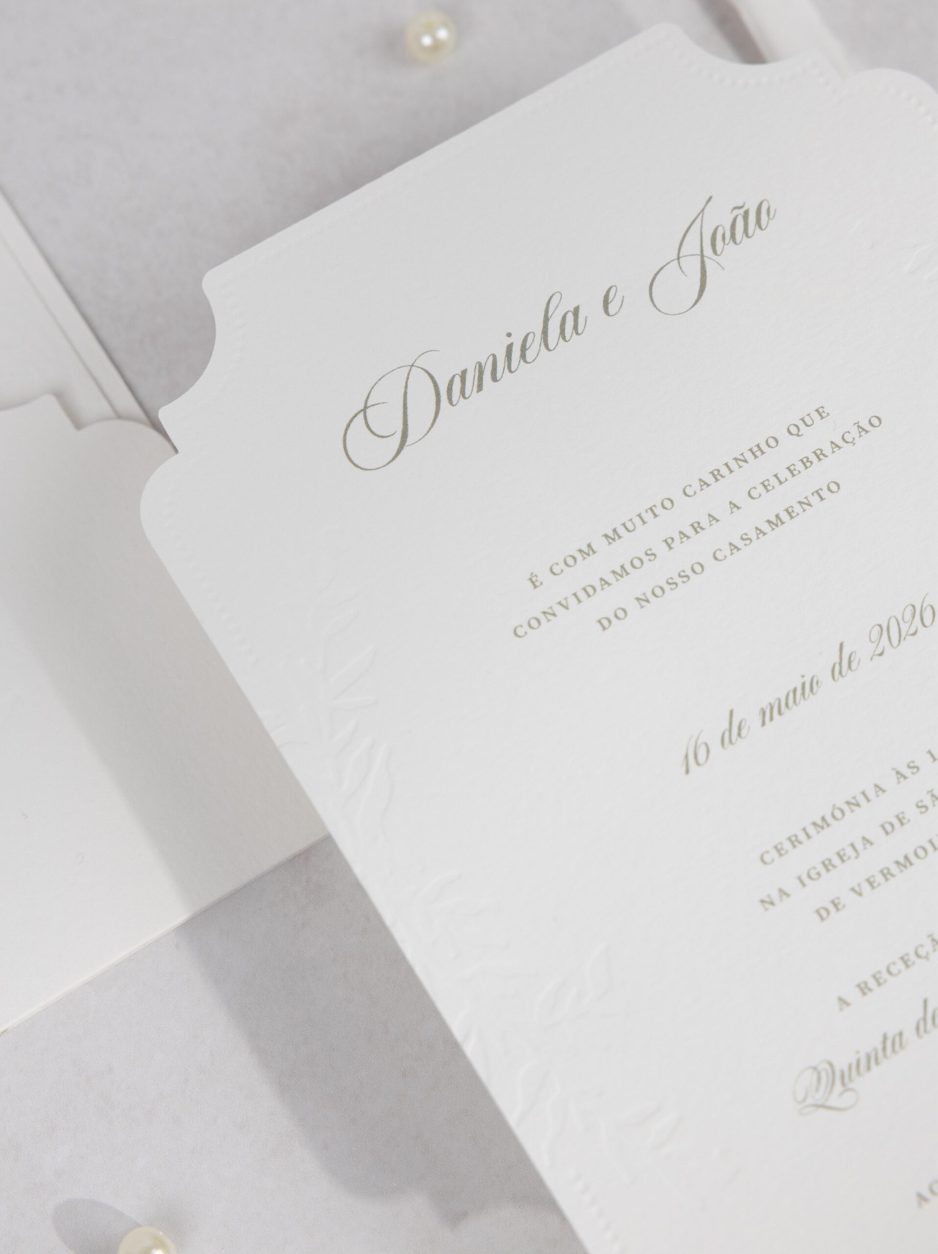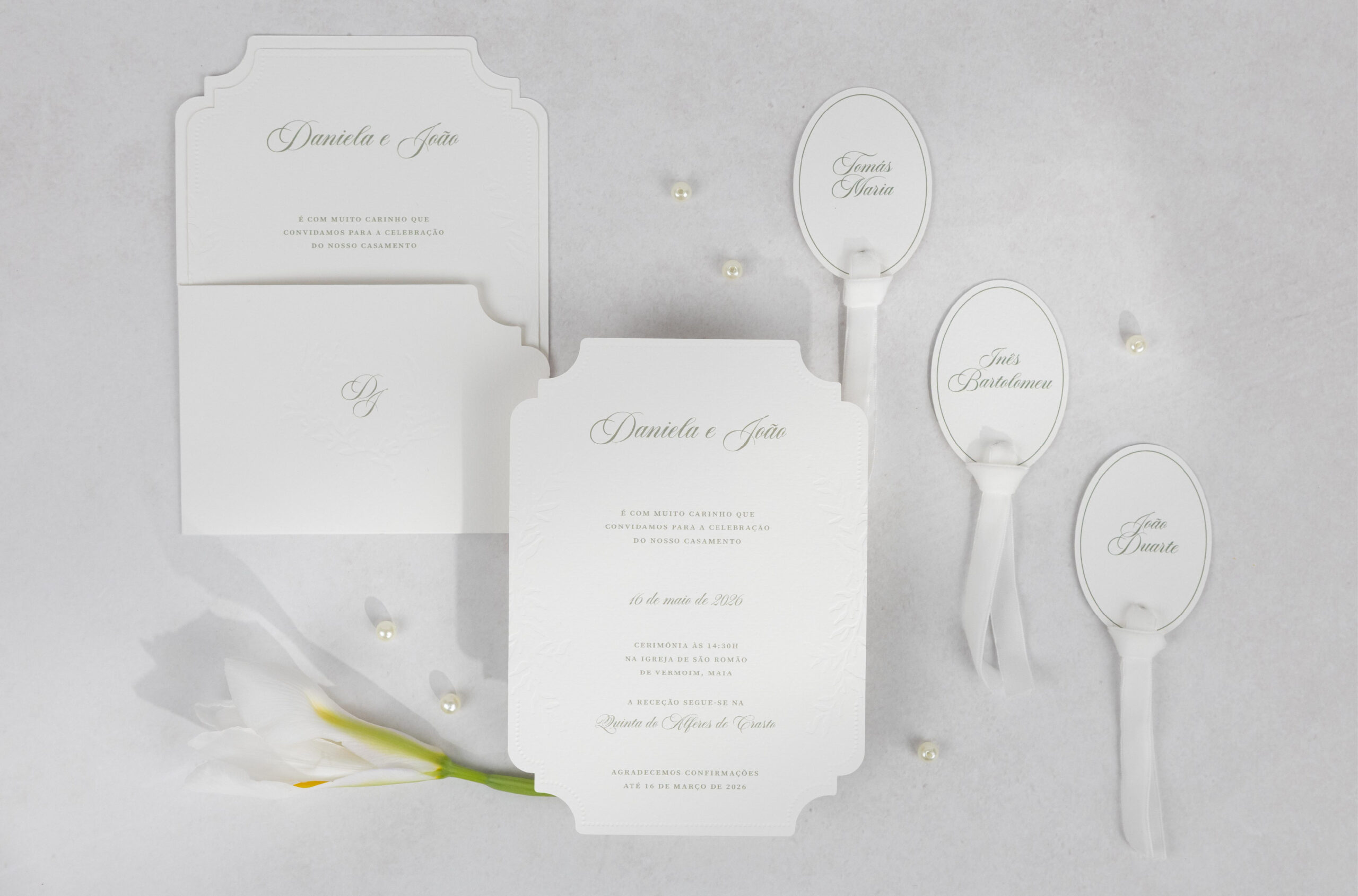 Intemporal, elegante e subtilmente sofisticado — assim é o convite criado para celebrar o casamento da Daniela e do João. Com uma estética clean e cuidadosamente equilibrada, este convite destaca-se pelo seu corte especial e pelos delicados detalhes em relevo, que acrescentam profundidade e textura sem comprometer a sua leveza. Cada elemento foi pensado para transmitir uma sensação de harmonia e requinte, onde o menos se torna, verdadeiramente, mais. O envelope, em formato gaveta, revela-se como uma peça central desta composição. No exterior, o monograma dos noivos surge envolvido por um elegante detalhe floral em relevo, criando um primeiro impacto visual discreto, mas marcante — um convite à descoberta do que está no seu interior. A identidade visual estende-se de forma coesa a todos os elementos do dia. As ementas seguem a mesma linha estética dos convites, mantendo o design minimalista e os apontamentos em relevo, reforçando a elegância em cada detalhe da mesa. Já os marcadores de lugar, com um delicado corte oval, são finalizados com uma fita de veludo, acrescentando um toque de suavidade e sofisticação que eleva toda a experiência. Este conjunto traduz na perfeição a essência da Daniela e do João — uma celebração onde a simplicidade se cruza com o detalhe, resultando num ambiente sereno, refinado e memorável.