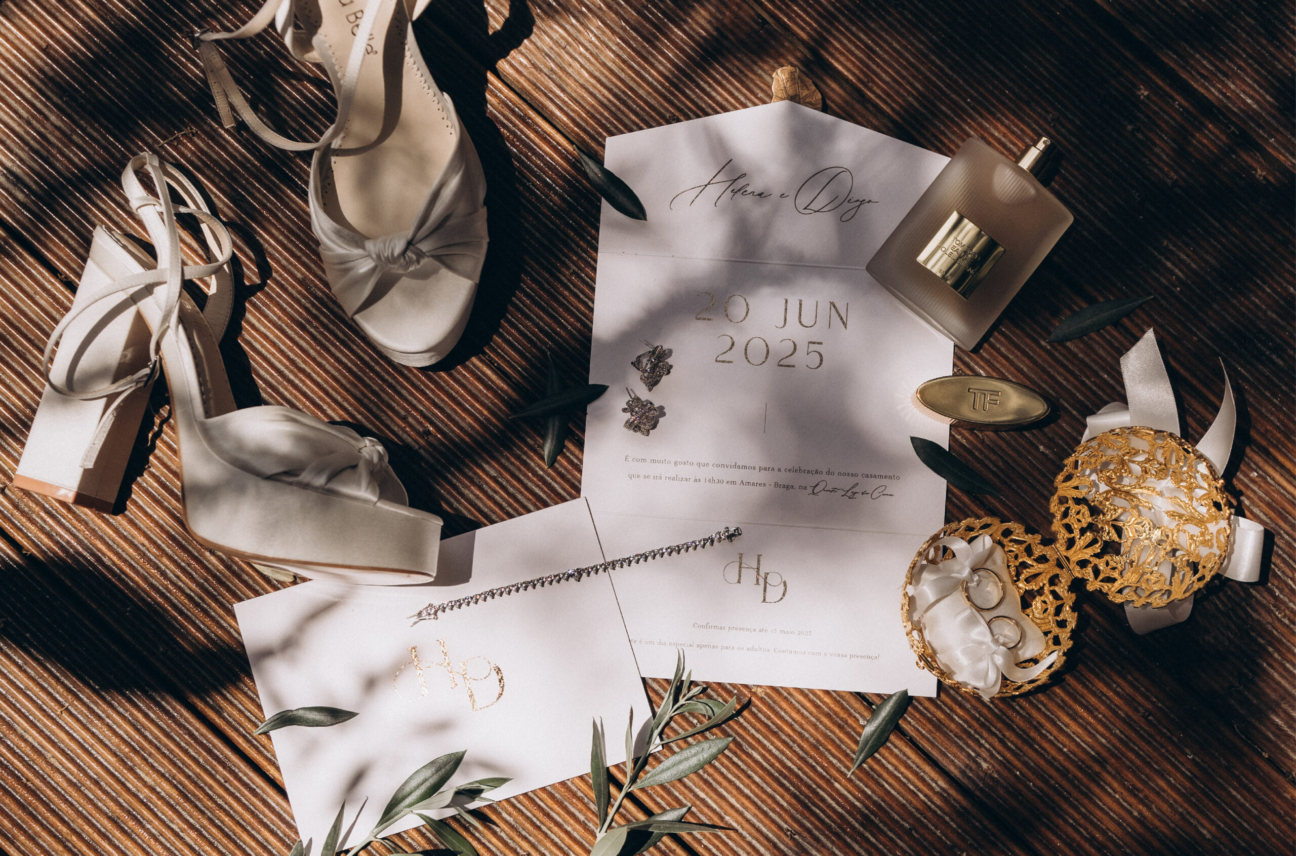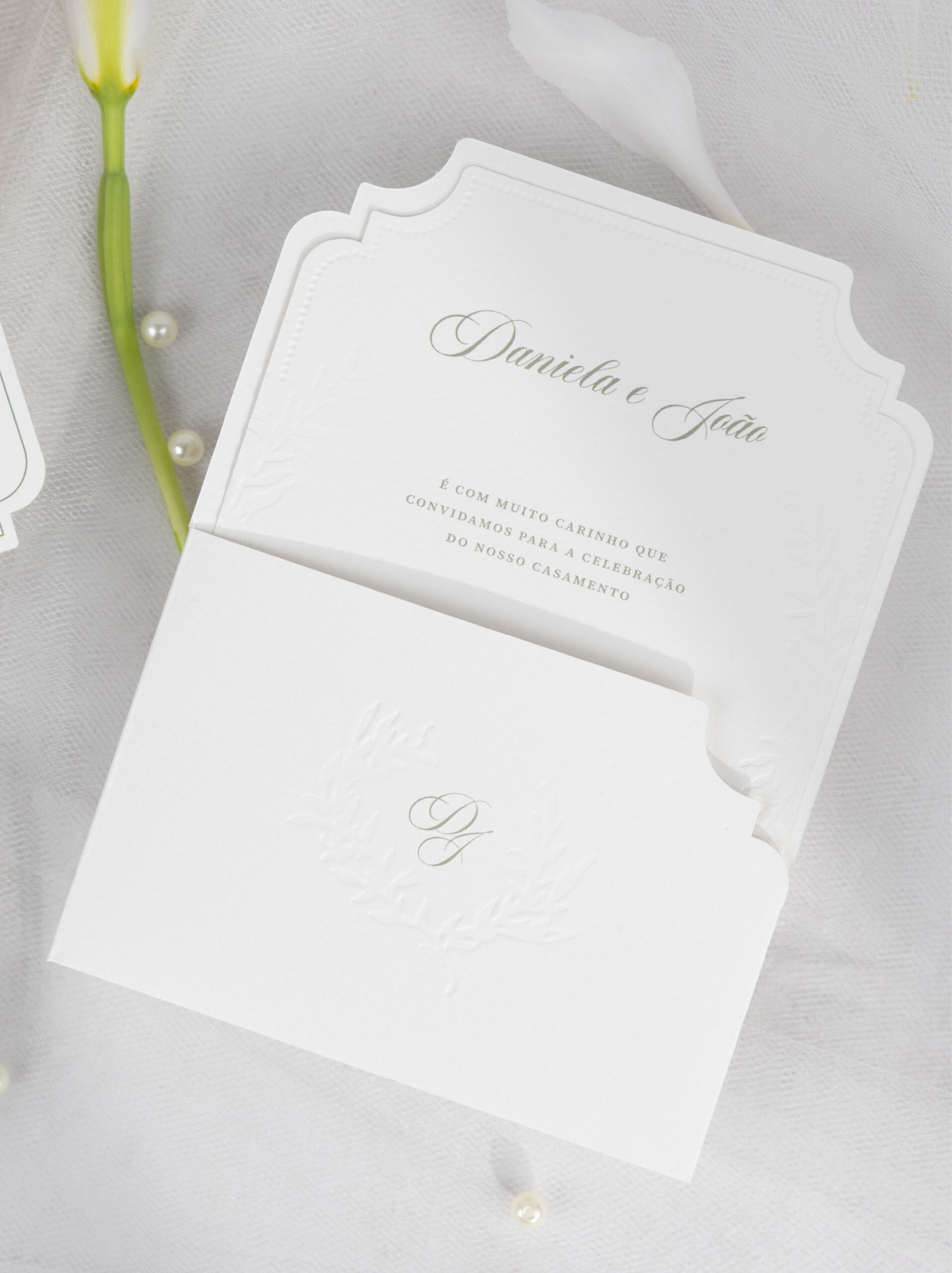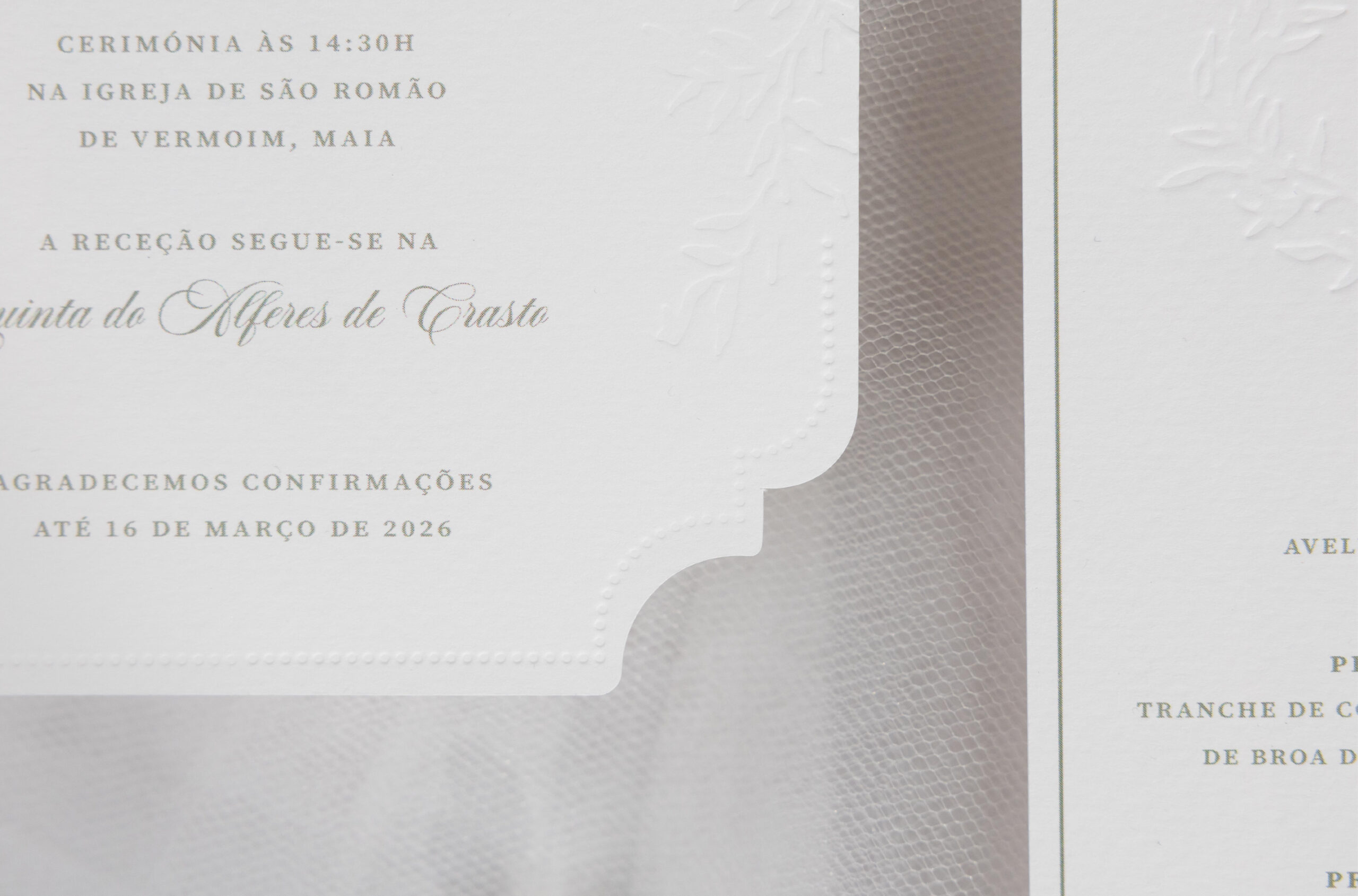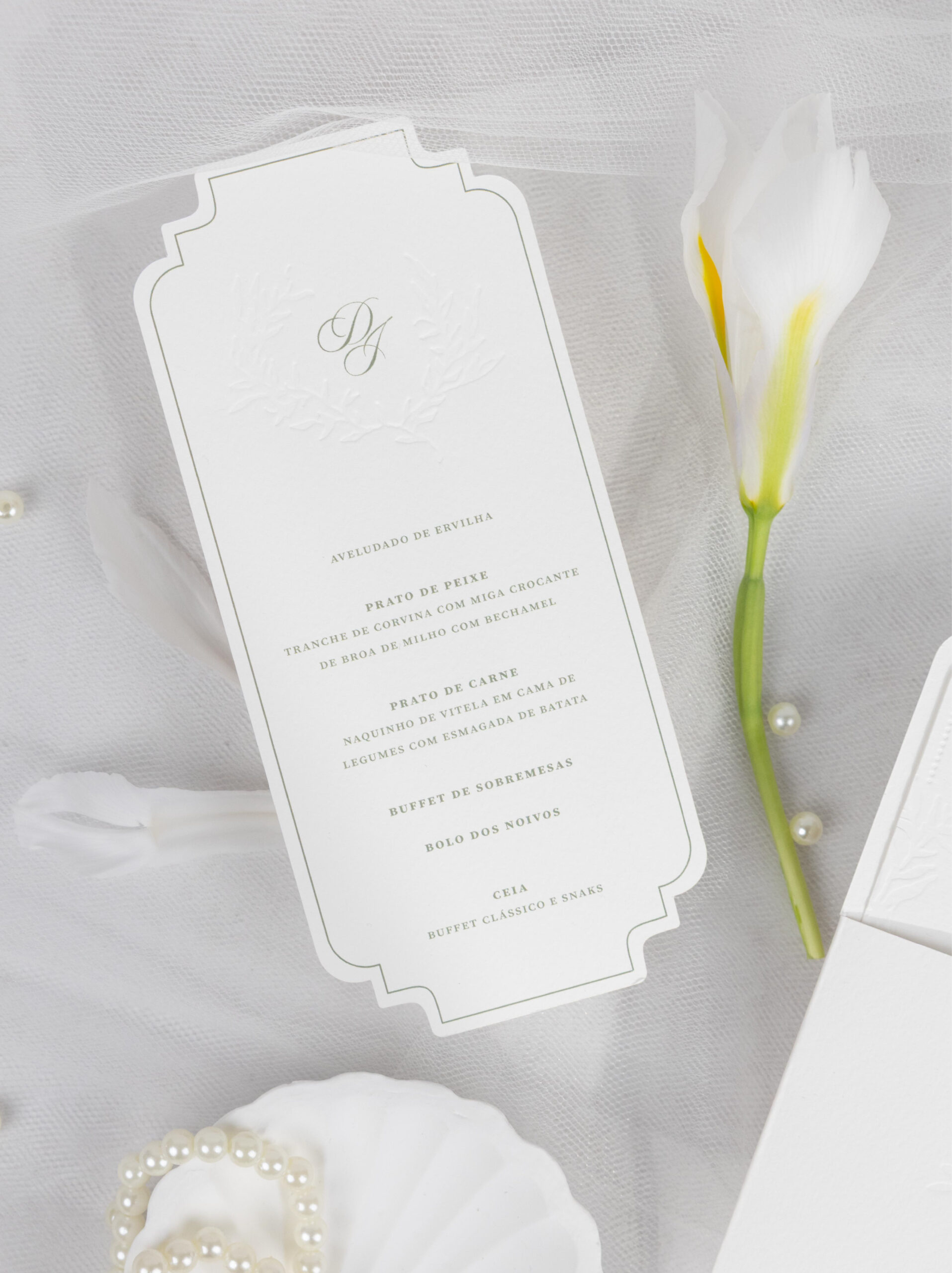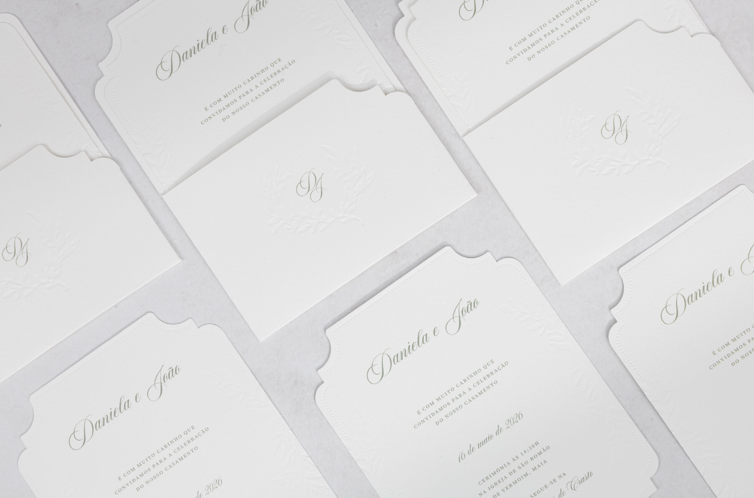 Intemporal, elegante e subtilmente sofisticado — assim é o convite criado para celebrar o casamento da Daniela e do João. Com uma estética clean e cuidadosamente equilibrada, este convite destaca-se pelo seu corte especial e pelos delicados detalhes em relevo, que acrescentam profundidade e textura sem comprometer a sua leveza. Cada elemento foi pensado para transmitir uma sensação de harmonia e requinte, onde o menos se torna, verdadeiramente, mais. O envelope, em formato gaveta, revela-se como uma peça central desta composição. No exterior, o monograma dos noivos surge envolvido por um elegante detalhe floral em relevo, criando um primeiro impacto visual discreto, mas marcante — um convite à descoberta do que está no seu interior. A identidade visual estende-se de forma coesa a todos os elementos do dia. As ementas seguem a mesma linha estética dos convites, mantendo o design minimalista e os apontamentos em relevo, reforçando a elegância em cada detalhe da mesa. Já os marcadores de lugar, com um delicado corte oval, são finalizados com uma fita de veludo, acrescentando um toque de suavidade e sofisticação que eleva toda a experiência. Este conjunto traduz na perfeição a essência da Daniela e do João — uma celebração onde a simplicidade se cruza com o detalhe, resultando num ambiente sereno, refinado e memorável.