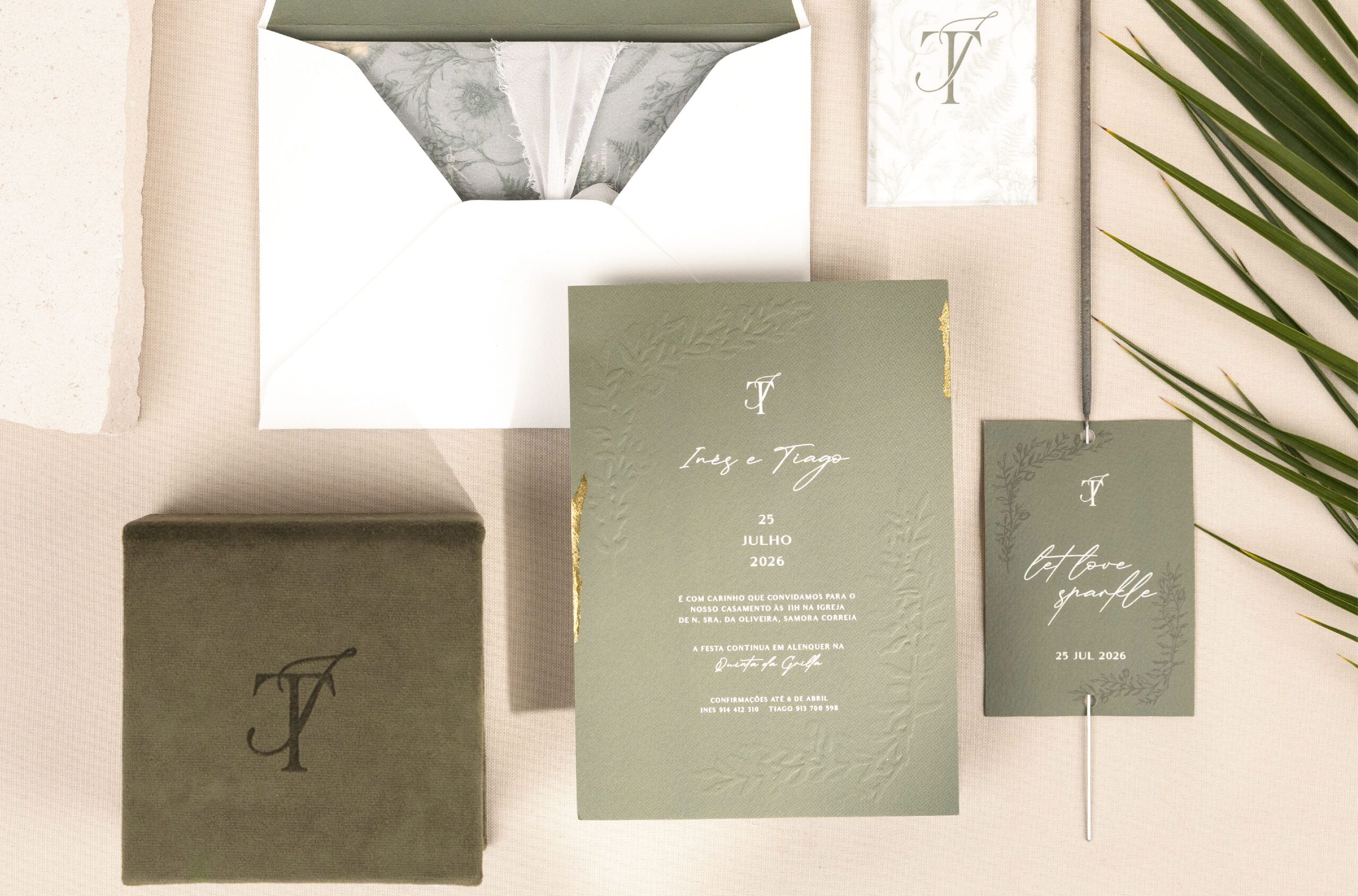 Para Magali e Alexis foi um casamento requintado e celebrado a verde e dourado com um convite perfeito a combinar, por isso desenvolvemos um convite de casamento com um monograma geométrico de foil dourado com uma caligrafia arredondada e uma moldura em forma de coração decorado com folhas de oliveira que se entrelaçam e estabelecem uma ligação entre a natureza e os tons pensados para o casamento dos nossos clientes. Para este convite selecionamos um envelope com o mesmo tom verde de algumas folhas de oliveira e selado com folhas de oliveira e um lacre dourado onde se destaca novamente o monograma do convite.