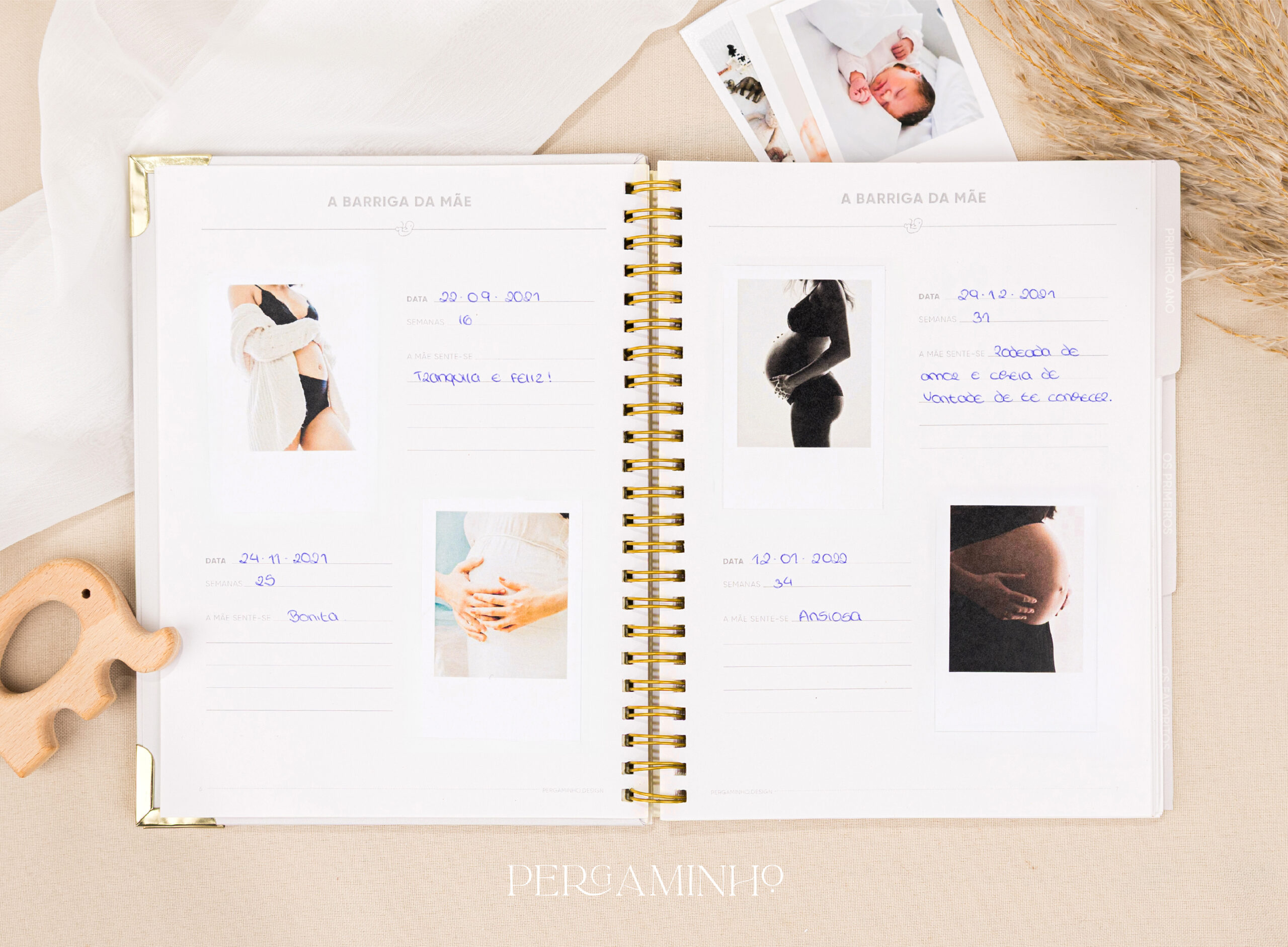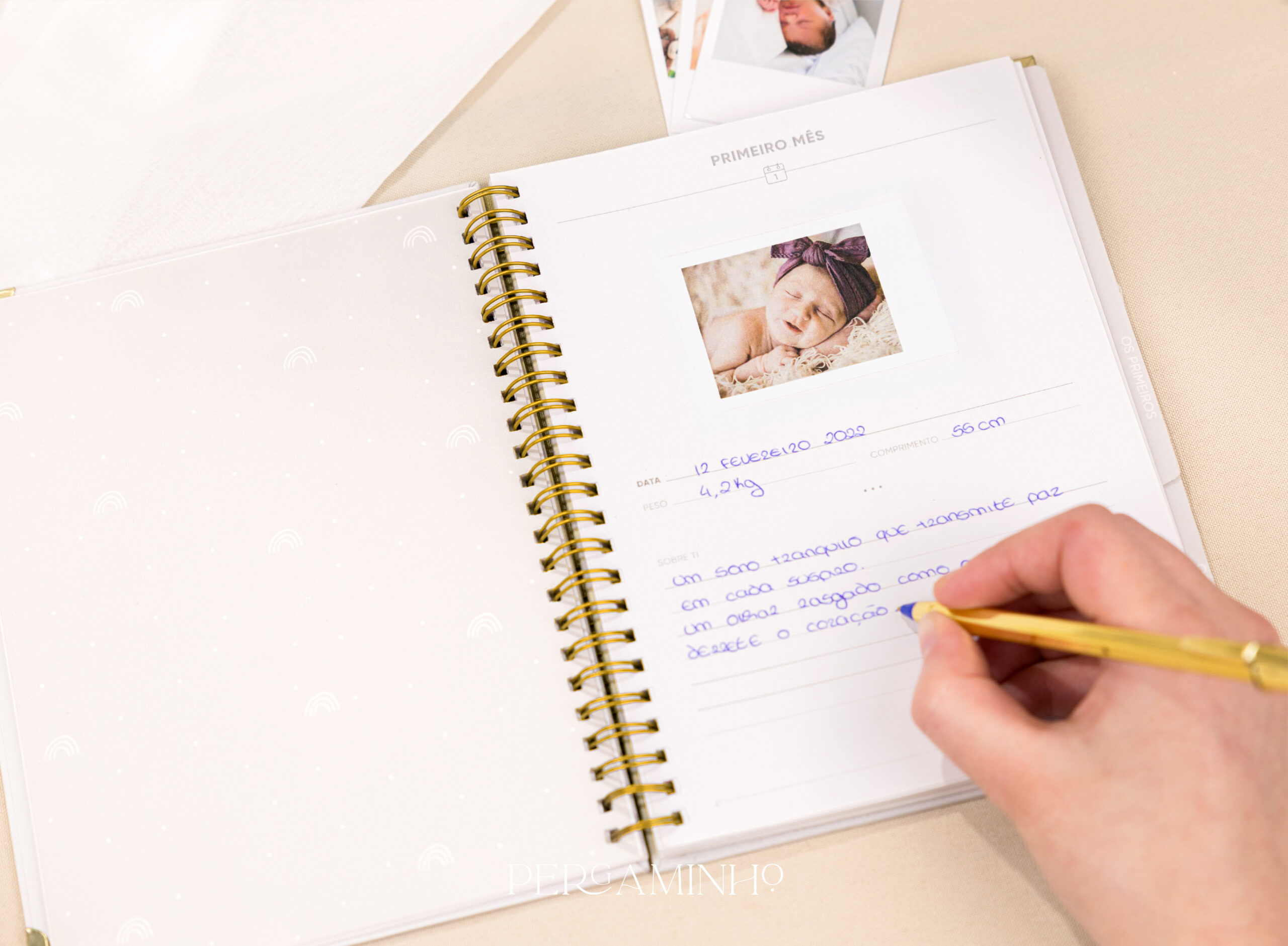 Na Pergaminho Design, entendemos a importância de capturar cada momento especial do seu bebé. Apresentamos O meu Diário do Bebé, um livro cuidadosamente projetado para registar todas as memórias preciosas desde o nascimento até aos primeiros passos e muito mais.